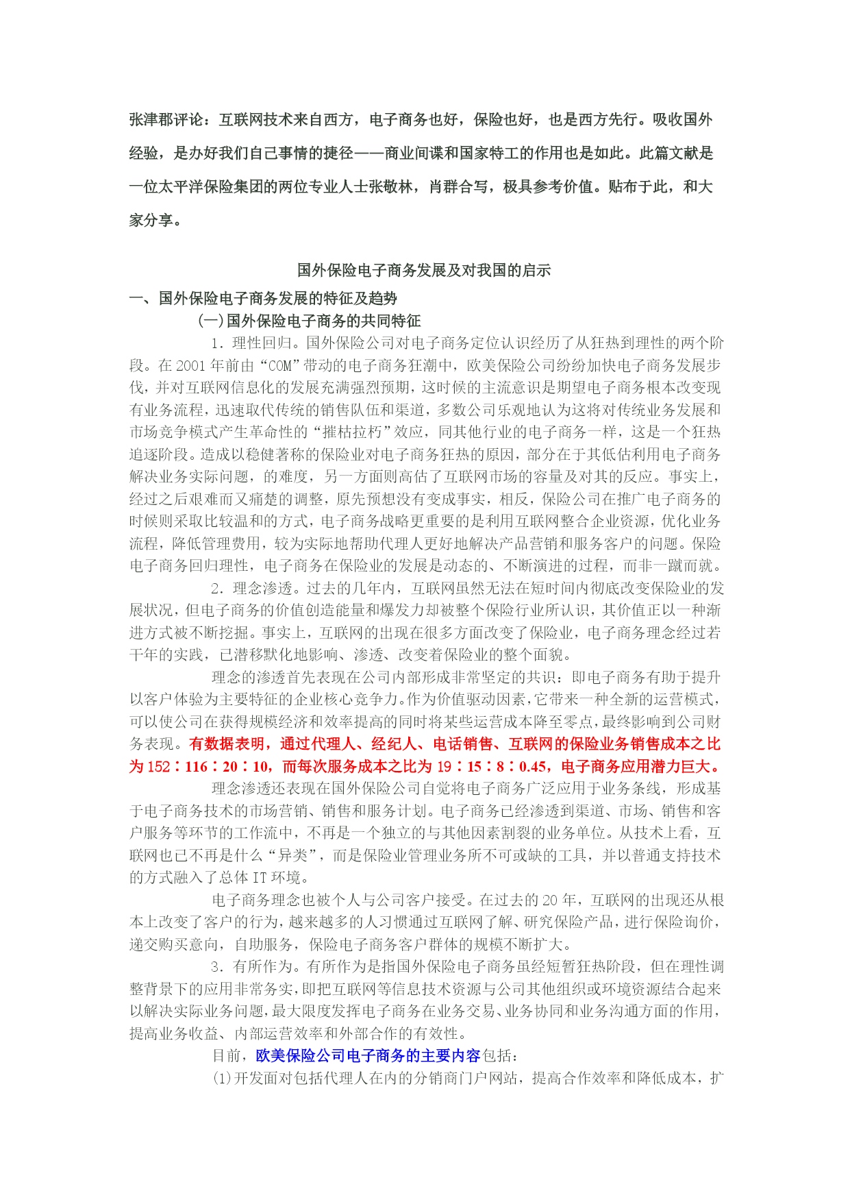 张津郡评论:互联网技术来自西方,电子商务也好,保险也好,也是西方先行。吸收国外经验,是办好我们自己事情的捷径——商业间谍和国家特工的作用也是如此。此篇文献是一位太平洋保险集团的两位专业人士张敬林,肖群合写,极具参考价值。贴布于此,和大家分享。国外保险电子商务发展及对我国的启示一、国外保险电子商务发展的特征及趋势(一)国外保险电子商务的共同特征1.理性回归。国外保险公司对电子商务定位认识经历了从狂热到理性的两个阶段。在2001年前由“COM”带动的电子商务狂潮中,欧美保险公司纷纷加快电子商务发展步伐,并对互