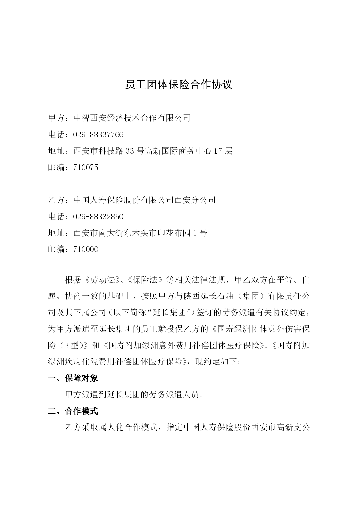 员工团体保险合作协议甲方:中智西安经济技术合作有限公司电话:029-88337766地址:西安市科技路33号高新国际商务中心17层邮编:710075乙方:中国人寿保险股份有限公司西安分公司电话:029-88332850地址:西安市南大街东木头市印花布园1号邮编:710000根据《劳动法》、《保险法》等相关法律法规,甲乙双方在平等、自愿、协商一致的基础上,按照甲方与陕西延长石油(集团)有限责任公司及其下属公司(以下简称“延长集团”)签订的劳务派遣有关协议约定,为甲方派遣至延长集团的员工就投保乙方的《国寿绿洲