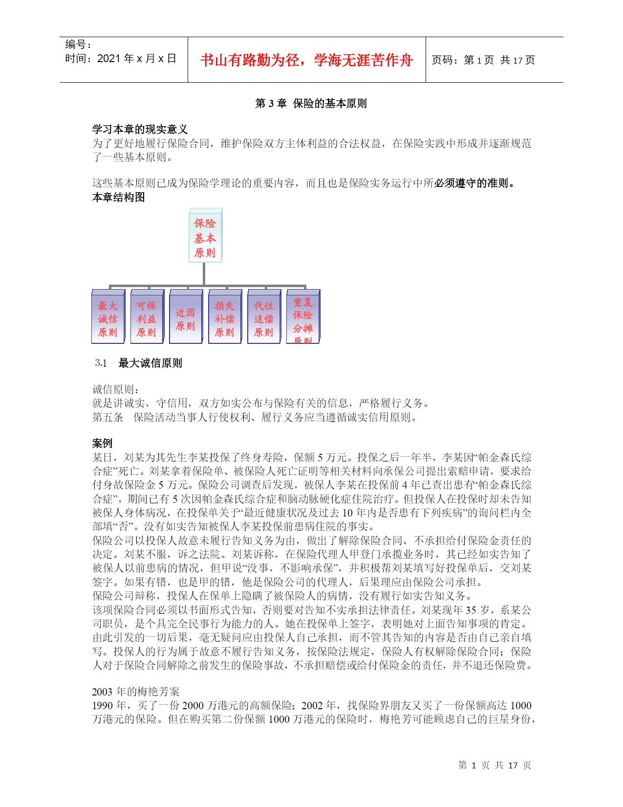 编号:时间:2021年x月x日书山有路勤为径,学海无涯苦作舟页码:第PAGE17页共NUMPAGES17页第PAGE\*MERGEFORMAT17页共NUMPAGES\*MERGEFORMAT17页第3章保险的基本原则学习本章的现实意义为了更好地履行保险合同,维护保险双方主体利益的合法权益,在保险实践中形成并逐渐规范了一些基本原则。这些基本原则已成为保险学理论的重要内容,而且也是保险实务运行中所必须遵守的准则。本章结构图保险基本原则最大诚信原则可保利益原则近因原则损失补偿原则代位追