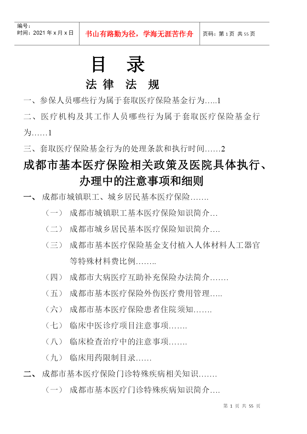 编号:时间:2021年x月x日书山有路勤为径,学海无涯苦作舟页码:第PAGE55页共NUMPAGES55页第PAGE\*MERGEFORMAT55页共NUMPAGES\*MERGEFORMAT55页目录法律法规一、参保人员哪些行为属于套取医疗保险基金行为…..1二、医疗机构及其工作人员哪些行为属于套取医疗保险基金行为……1三、套取医疗保险基金行为的处理条款和执行时间……2成都市基本医疗保险相关政策及医院具体执行、办理中的注意事项和细则成都市城镇职工、城乡居民基本医疗保险…….成都市
