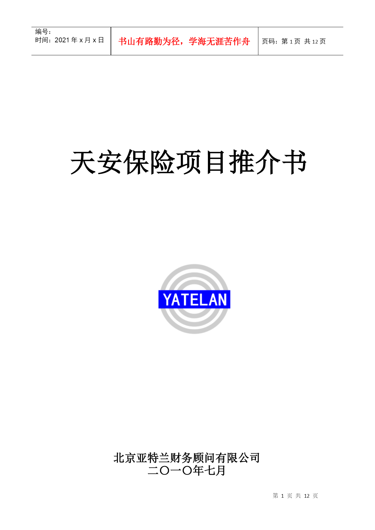 编号:时间:2021年x月x日书山有路勤为径,学海无涯苦作舟页码:第PAGE12页共NUMPAGES12页第PAGE\*MERGEFORMAT12页共NUMPAGES\*MERGEFORMAT12页天安保险项目推介书北京亚特兰财务顾问有限公司二〇一〇年七月一、公司简介1.基本情况天安保险股份有限公司是中国首家按照现代企业制度和国际标准组建的股份制商业保险公司,成立于1994年10月,总部设在上海浦东,注册资本人民币2,172,276,298元。公司成立15年来,业务规模和机构建设快
