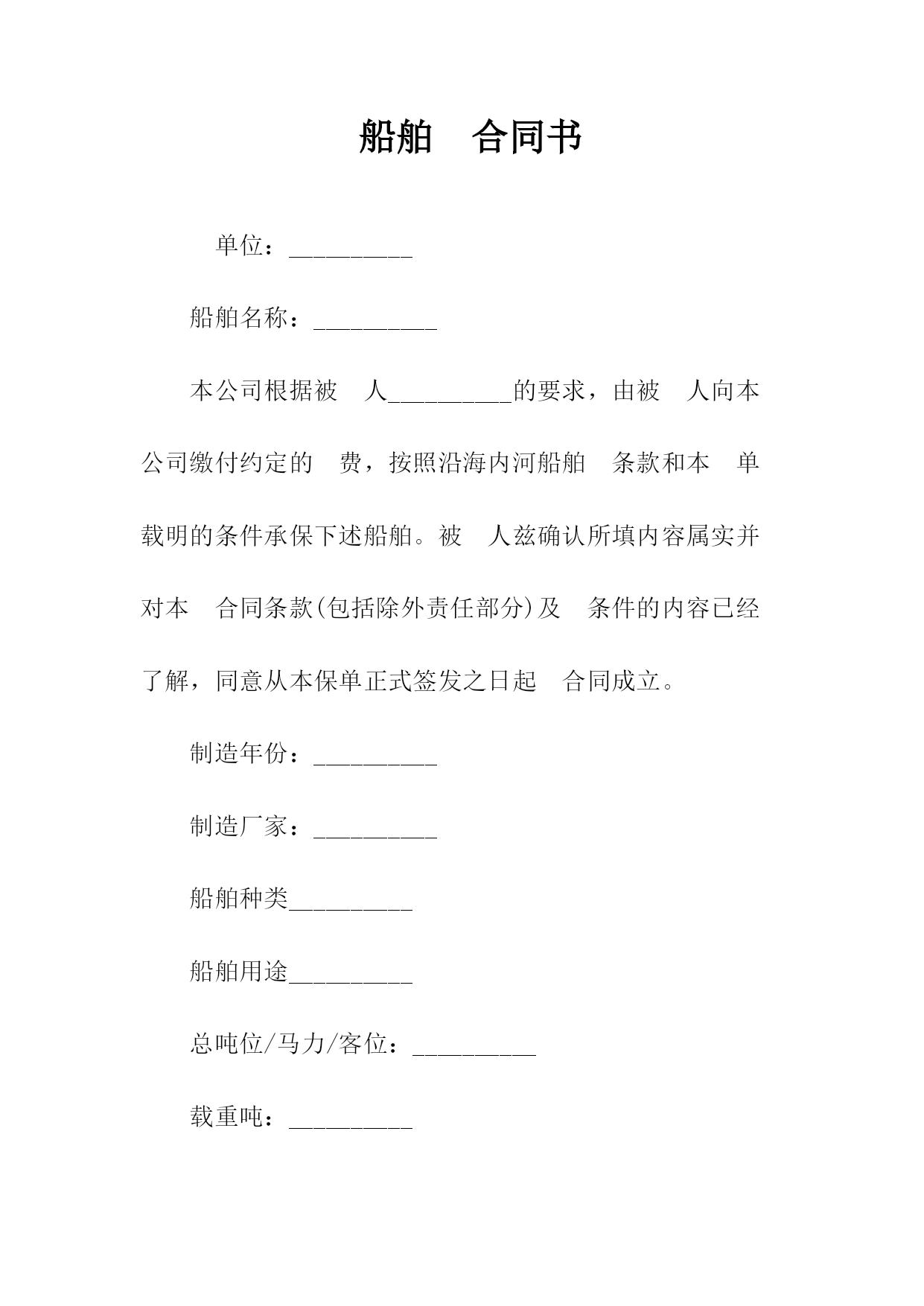 船舶合同书单位:__________船舶名称:__________本公司根据被人__________的要求,由被人向本公司缴付约定的费,按照沿海内河船舶条款和本单载明的条件承保下述船舶。被人兹确认所填内容属实并对本合同条款(包括除外责任部分)及条件的内容已经了解,同意从本保单正式签发之日起合同成立。制造年份:__________制造厂家:__________船舶种类__________船舶用途__________总吨位/马力/客位:__________载重吨:__________船舶尺寸:(总长)____