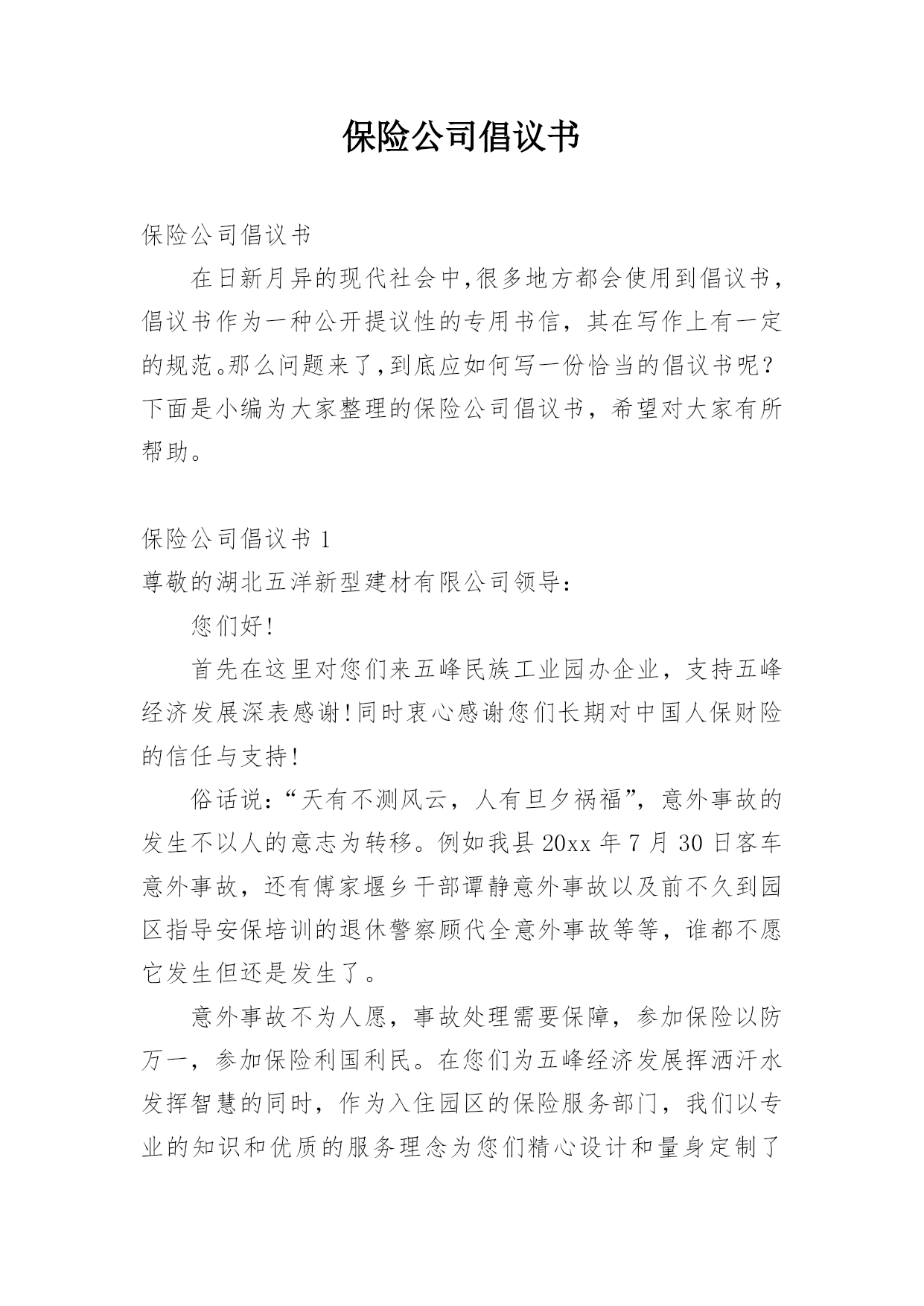 保险公司倡议书保险公司倡议书在日新月异的现代社会中,很多地方都会使用到倡议书,倡议书作为一种公开提议性的专用书信,其在写作上有一定的规范。那么问题来了,到底应如何写一份恰当的倡议书呢?下面是小编为大家整理的保险公司倡议书,希望对大家有所帮助。保险公司倡议书1尊敬的湖北五洋新型建材有限公司领导:您们好!首先在这里对您们来五峰民族工业园办企业,支持五峰经济发展深表感谢!同时衷心感谢您们长期对中国人保财险的信任与支持!俗话说:“天有不测风云,人有旦夕祸福”,意外事故的发生不以人的意志为转移。例如我县20xx年7