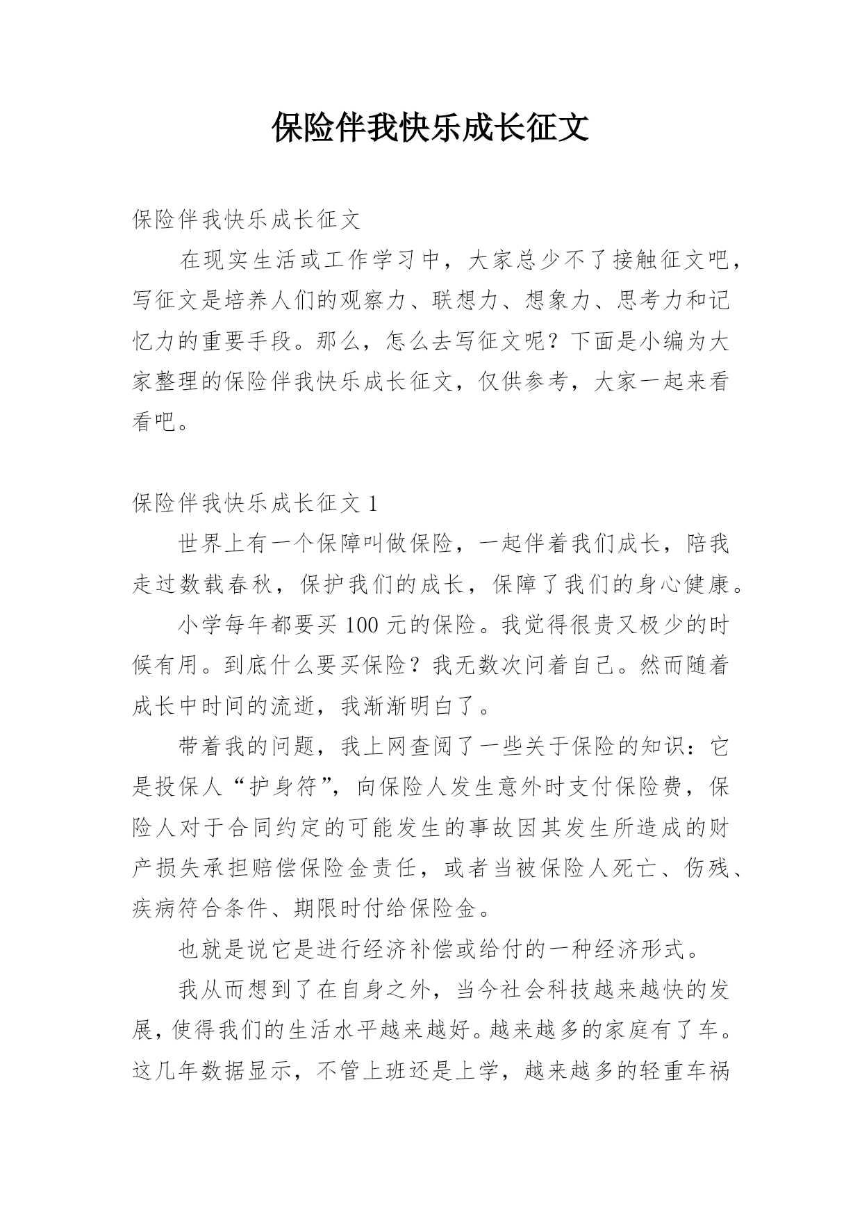 保险伴我快乐成长征文保险伴我快乐成长征文在现实生活或工作学习中,大家总少不了接触征文吧,写征文是培养人们的观察力、联想力、想象力、思考力和记忆力的重要手段。那么,怎么去写征文呢?下面是小编为大家整理的保险伴我快乐成长征文,仅供参考,大家一起来看看吧。保险伴我快乐成长征文1世界上有一个保障叫做保险,一起伴着我们成长,陪我走过数载春秋,保护我们的成长,保障了我们的身心健康。小学每年都要买100元的保险。我觉得很贵又极少的时候有用。到底什么要买保险?我无数次问着自己。然而随着成长中时间的流逝,我渐渐明白了。带着