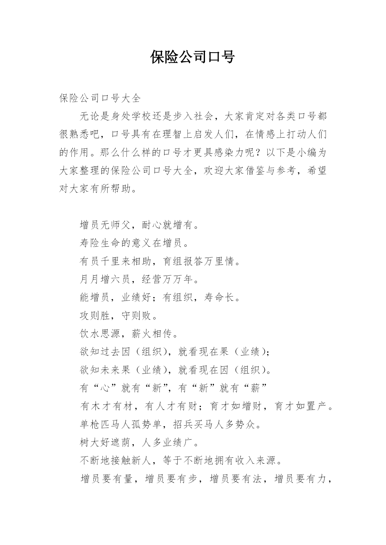 保险公司口号保险公司口号大全无论是身处学校还是步入社会,大家肯定对各类口号都很熟悉吧,口号具有在理智上启发人们,在情感上打动人们的作用。那么什么样的口号才更具感染力呢?以下是小编为大家整理的保险公司口号大全,欢迎大家借鉴与参考,希望对大家有所帮助。增员无师父,耐心就增有。寿险生命的意义在增员。有员千里来相助,育组报答万里情。月月增六员,经营万万年。能增员,业绩好;有组织,寿命长。攻则胜,守则败。饮水思源,薪火相传。欲知过去因(组织),就看现在果(业绩);欲知未来果(业绩),就看现在因(组织)。有“心”就有