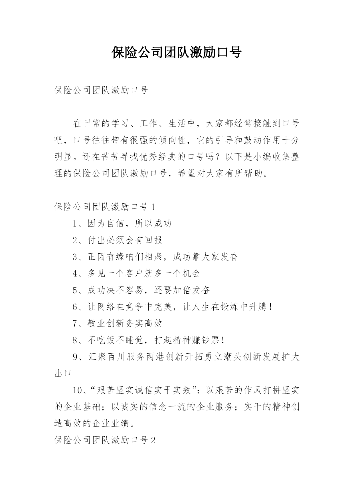 保险公司团队激励口号保险公司团队激励口号在日常的学习、工作、生活中,大家都经常接触到口号吧,口号往往带有很强的倾向性,它的引导和鼓动作用十分明显。还在苦苦寻找优秀经典的口号吗?以下是小编收集整理的保险公司团队激励口号,希望对大家有所帮助。保险公司团队激励口号11、因为自信,所以成功2、付出必须会有回报3、正因有缘咱们相聚,成功靠大家发奋4、多见一个客户就多一个机会5、成功决不容易,还要加倍发奋6、让网络在竞争中完美,让人生在锻炼中升腾!7、敬业创新务实高效8、不吃饭不睡觉,打起精神赚钞票!9、汇聚百川服务