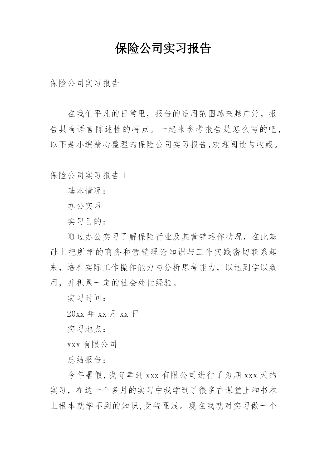 保险公司实习报告保险公司实习报告在我们平凡的日常里,报告的适用范围越来越广泛,报告具有语言陈述性的特点。一起来参考报告是怎么写的吧,以下是小编精心整理的保险公司实习报告,欢迎阅读与收藏。保险公司实习报告1基本情况:办公实习实习目的:通过办公实习了解保险行业及其营销运作状况,在此基础上把所学的商务和营销理论知识与工作实践密切联系起来,培养实际工作操作能力与分析思考能力,以达到学以致用,并积累一定的社会处世经验。实习时间:20xx年xx月xx日实习地点:xxx有限公司总结报告:今年暑假,我有幸到xxx有限公司
