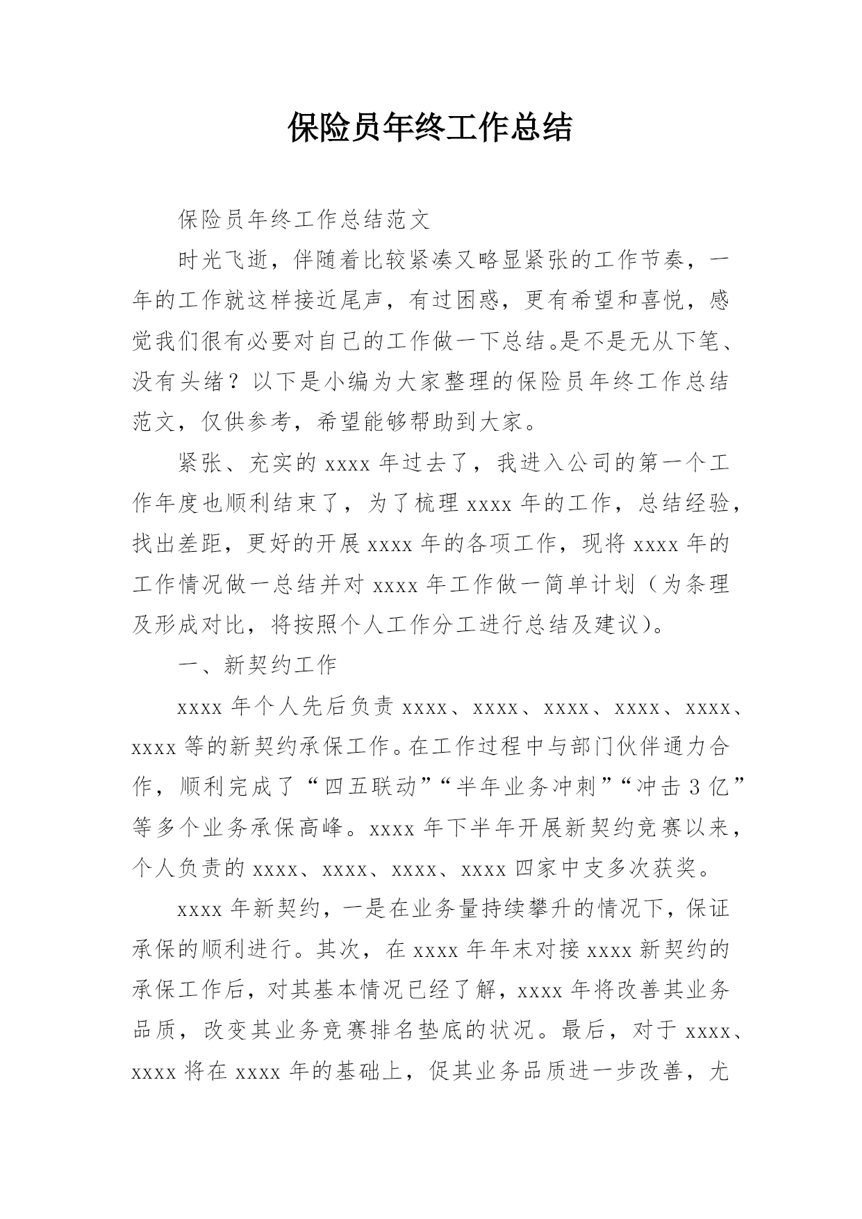 保险员年终工作总结保险员年终工作总结范文时光飞逝,伴随着比较紧凑又略显紧张的工作节奏,一年的工作就这样接近尾声,有过困惑,更有希望和喜悦,感觉我们很有必要对自己的工作做一下总结。是不是无从下笔、没有头绪?以下是小编为大家整理的保险员年终工作总结范文,仅供参考,希望能够帮助到大家。紧张、充实的xxxx年过去了,我进入公司的第一个工作年度也顺利结束了,为了梳理xxxx年的工作,总结经验,找出差距,更好的开展xxxx年的各项工作,现将xxxx年的工作情况做一总结并对xxxx年工作做一简单计划(为条理及形成对比,
