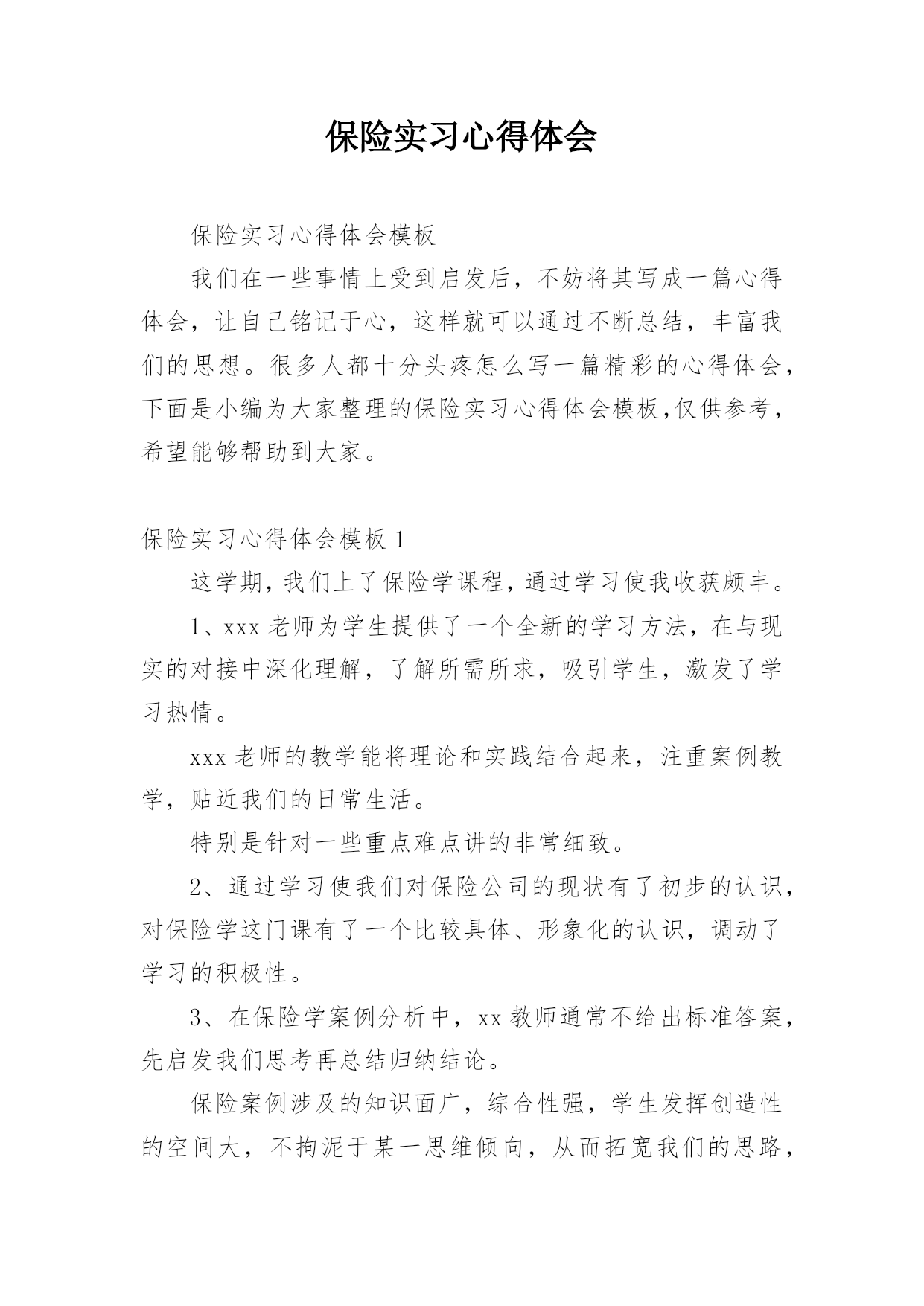 保险实习心得体会保险实习心得体会模板我们在一些事情上受到启发后,不妨将其写成一篇心得体会,让自己铭记于心,这样就可以通过不断总结,丰富我们的思想。很多人都十分头疼怎么写一篇精彩的心得体会,下面是小编为大家整理的保险实习心得体会模板,仅供参考,希望能够帮助到大家。保险实习心得体会模板1这学期,我们上了保险学课程,通过学习使我收获颇丰。1、xxx老师为学生提供了一个全新的学习方法,在与现实的对接中深化理解,了解所需所求,吸引学生,激发了学习热情。xxx老师的教学能将理论和实践结合起来,注重案例教学,贴近我们的