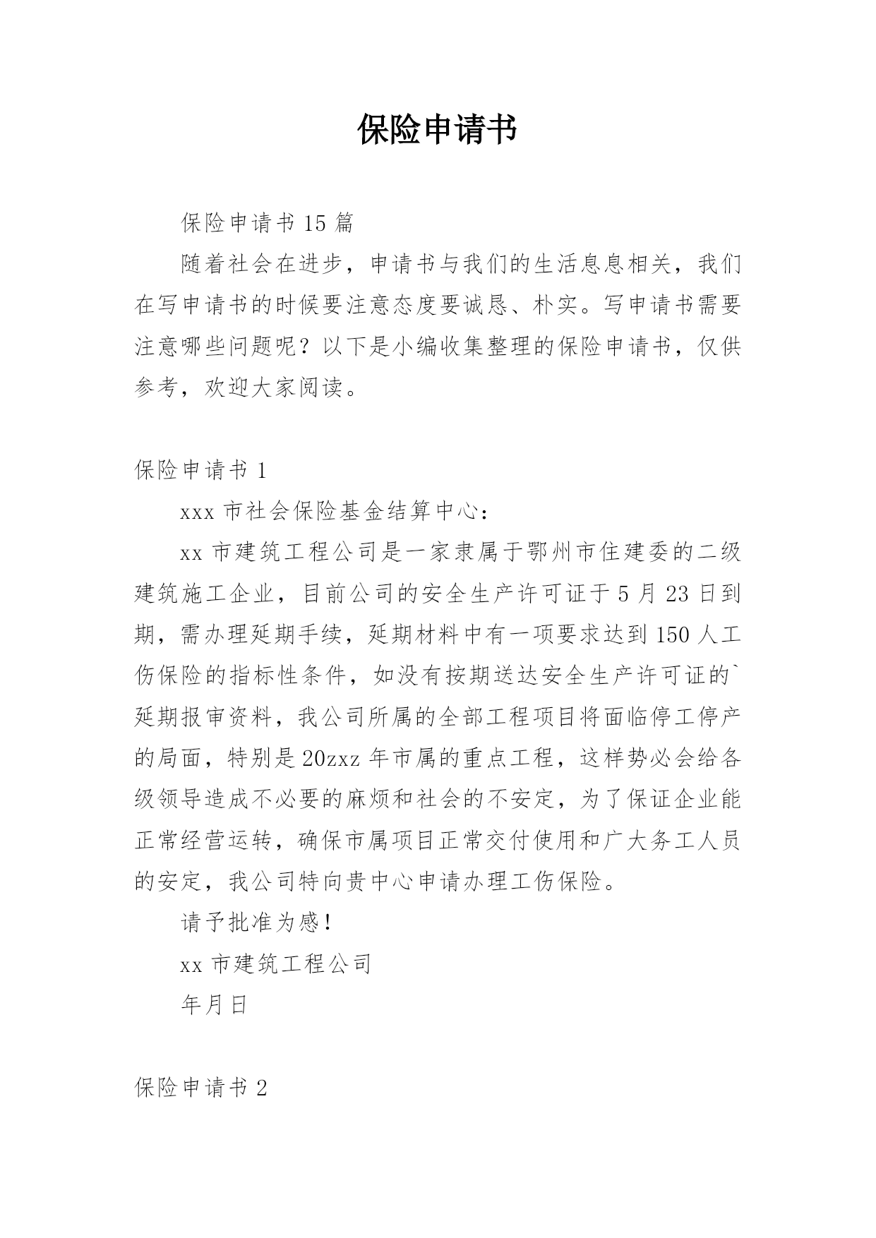 保险申请书保险申请书15篇随着社会在进步,申请书与我们的生活息息相关,我们在写申请书的时候要注意态度要诚恳、朴实。写申请书需要注意哪些问题呢?以下是小编收集整理的保险申请书,仅供参考,欢迎大家阅读。保险申请书1xxx市社会保险基金结算中心:xx市建筑工程公司是一家隶属于鄂州市住建委的二级建筑施工企业,目前公司的安全生产许可证于5月23日到期,需办理延期手续,延期材料中有一项要求达到150人工伤保险的指标性条件,如没有按期送达安全生产许可证的`延期报审资料,我公司所属的全部工程项目将面临停工停产的局面,特别