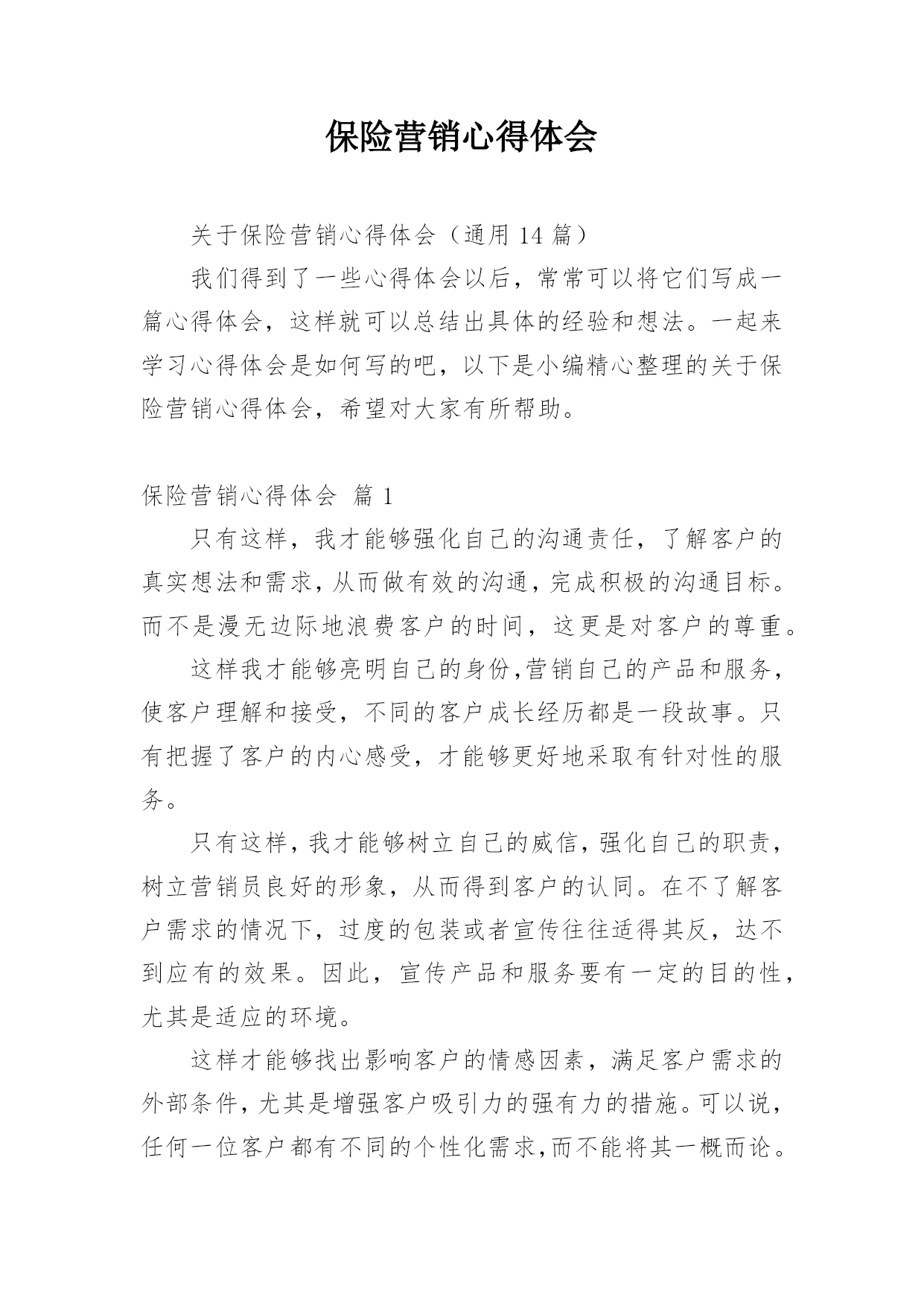 保险营销心得体会关于保险营销心得体会(通用14篇)我们得到了一些心得体会以后,常常可以将它们写成一篇心得体会,这样就可以总结出具体的经验和想法。一起来学习心得体会是如何写的吧,以下是小编精心整理的关于保险营销心得体会,希望对大家有所帮助。保险营销心得体会篇1只有这样,我才能够强化自己的沟通责任,了解客户的真实想法和需求,从而做有效的沟通,完成积极的沟通目标。而不是漫无边际地浪费客户的时间,这更是对客户的尊重。这样我才能够亮明自己的身份,营销自己的产品和服务,使客户理解和接受,不同的客户成长经历都是一段故事
