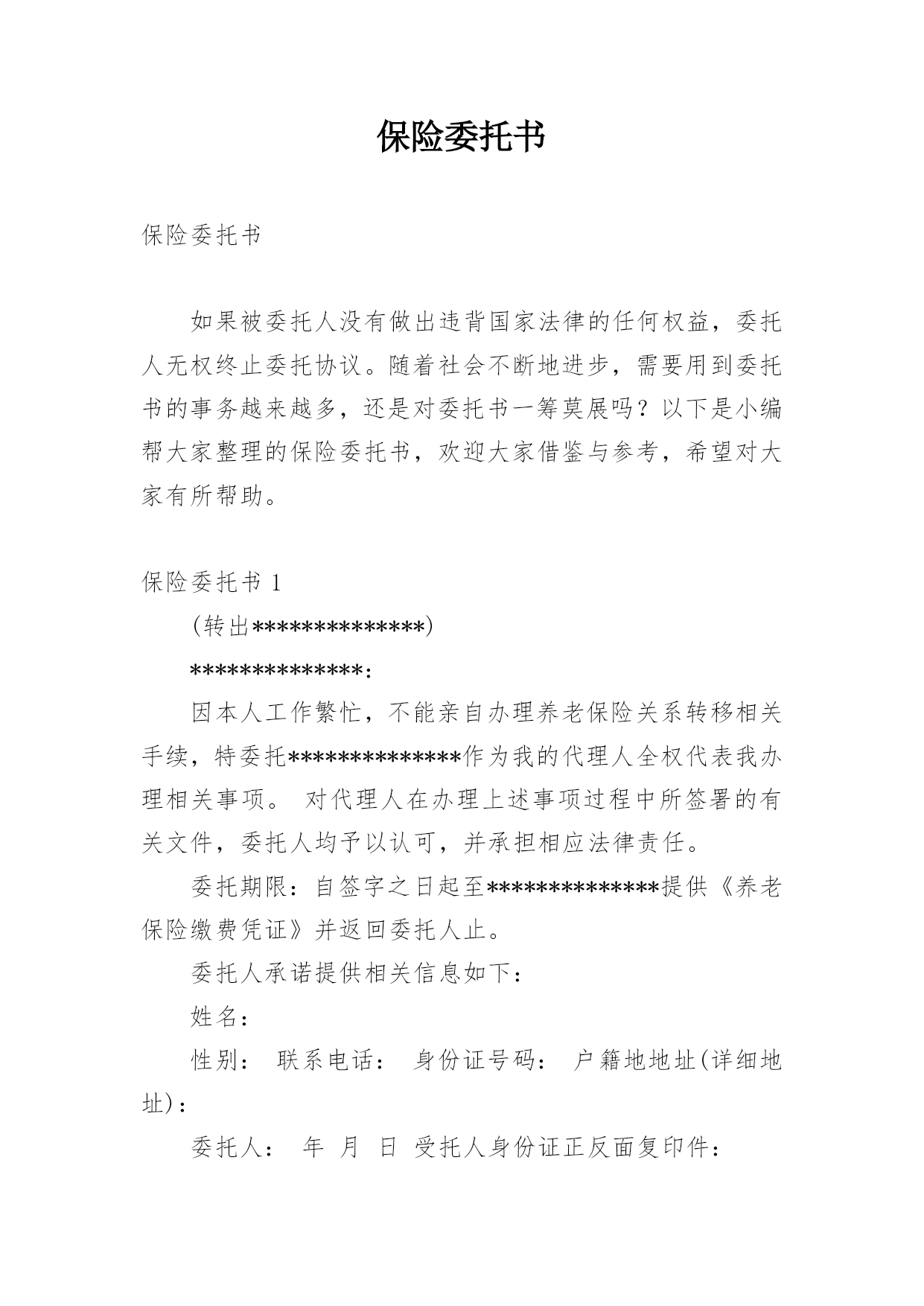 保险委托书保险委托书如果被委托人没有做出违背国家法律的任何权益,委托人无权终止委托协议。随着社会不断地进步,需要用到委托书的事务越来越多,还是对委托书一筹莫展吗?以下是小编帮大家整理的保险委托书,欢迎大家借鉴与参考,希望对大家有所帮助。保险委托书1(转出**************)**************:因本人工作繁忙,不能亲自办理养老保险关系转移相关手续,特委托**************作为我的代理人全权代表我办理相关事项。对代理人在办理上述事项过程中所签署的有关文件,委托人均予以认可,并承担