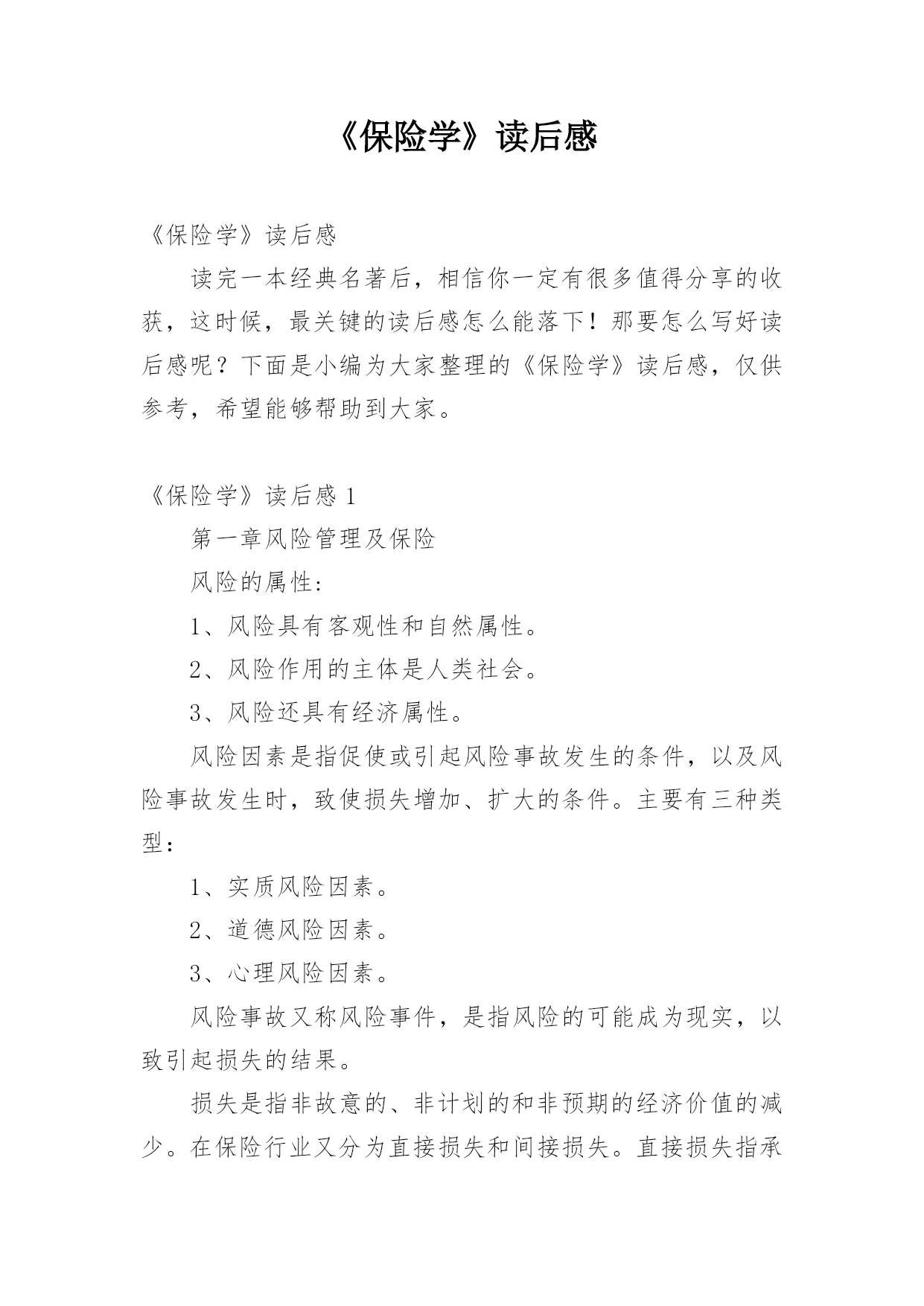 《保险学》读后感《保险学》读后感读完一本经典名著后,相信你一定有很多值得分享的收获,这时候,最关键的读后感怎么能落下!那要怎么写好读后感呢?下面是小编为大家整理的《保险学》读后感,仅供参考,希望能够帮助到大家。《保险学》读后感1第一章风险管理及保险风险的属性:1、风险具有客观性和自然属性。2、风险作用的主体是人类社会。3、风险还具有经济属性。风险因素是指促使或引起风险事故发生的条件,以及风险事故发生时,致使损失增加、扩大的条件。主要有三种类型:1、实质风险因素。2、道德风险因素。3、心理风险因素。风险事故