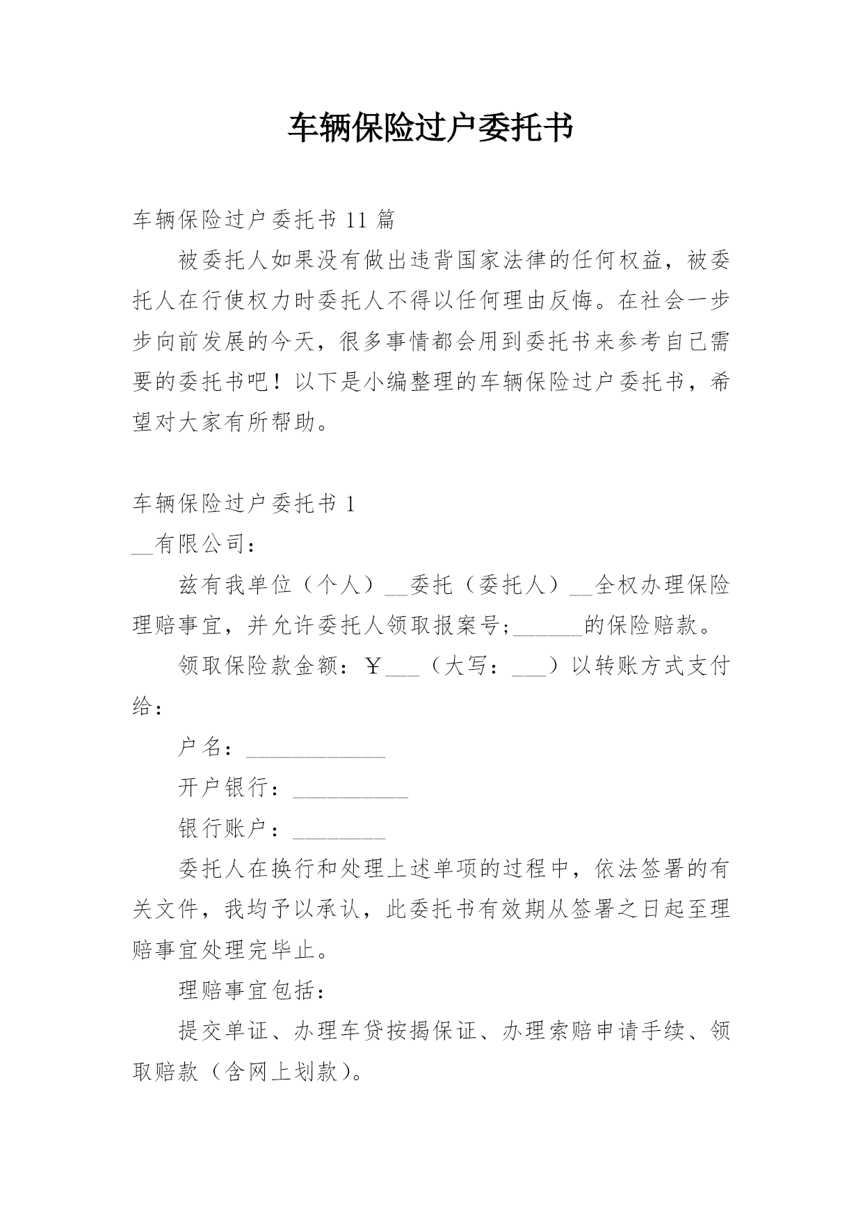 车辆保险过户委托书车辆保险过户委托书11篇被委托人如果没有做出违背国家法律的任何权益,被委托人在行使权力时委托人不得以任何理由反悔。在社会一步步向前发展的今天,很多事情都会用到委托书来参考自己需要的委托书吧!以下是小编整理的车辆保险过户委托书,希望对大家有所帮助。车辆保险过户委托书1__有限公司:兹有我单位(个人)__委托(委托人)__全权办理保险理赔事宜,并允许委托人领取报案号;______的保险赔款。领取保险款金额:¥___(大写:___)以转账方式支付给:户名:____________开户银行:__