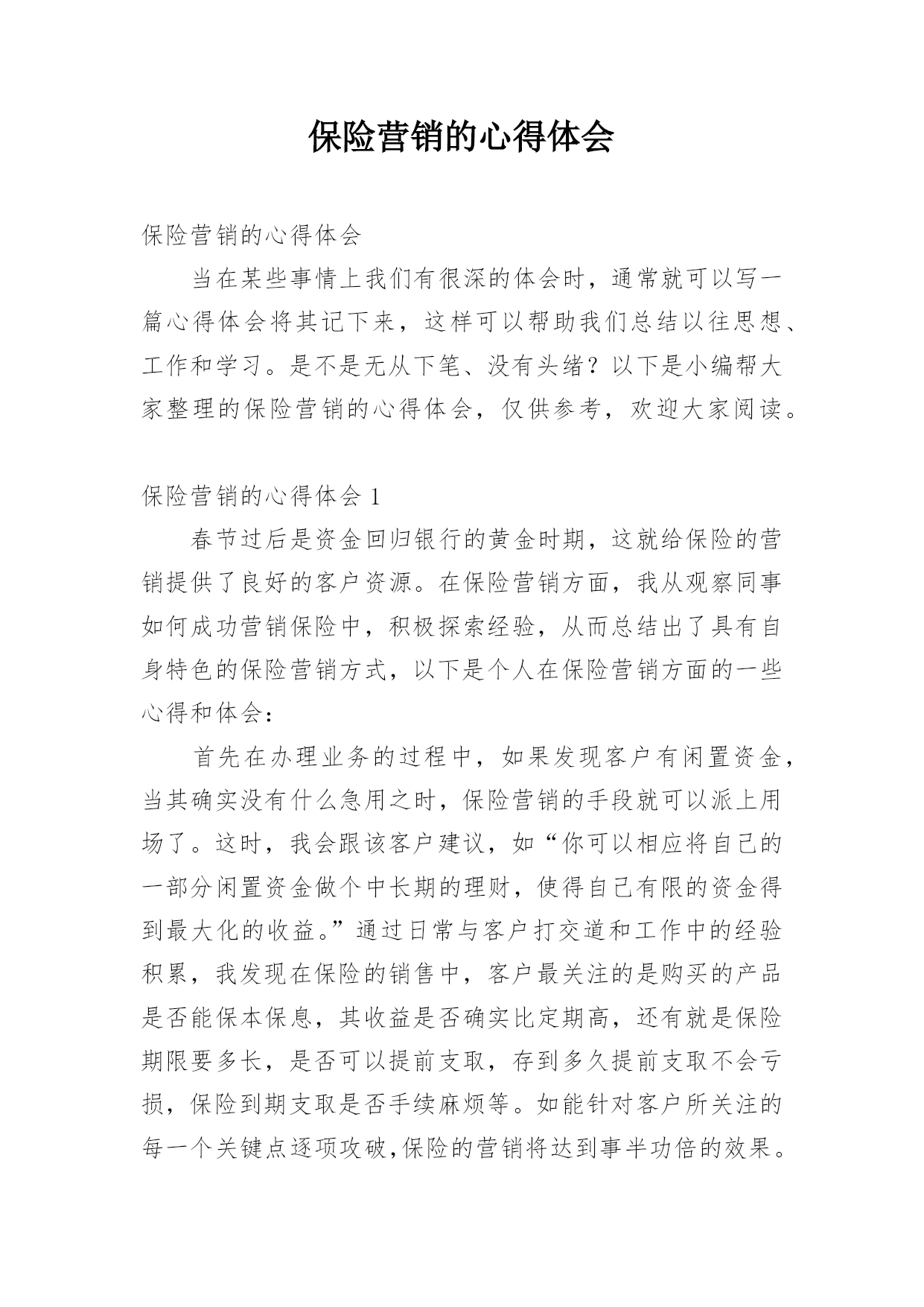 保险营销的心得体会保险营销的心得体会当在某些事情上我们有很深的体会时,通常就可以写一篇心得体会将其记下来,这样可以帮助我们总结以往思想、工作和学习。是不是无从下笔、没有头绪?以下是小编帮大家整理的保险营销的心得体会,仅供参考,欢迎大家阅读。保险营销的心得体会1春节过后是资金回归银行的黄金时期,这就给保险的营销提供了良好的客户资源。在保险营销方面,我从观察同事如何成功营销保险中,积极探索经验,从而总结出了具有自身特色的保险营销方式,以下是个人在保险营销方面的一些心得和体会:首先在办理业务的过程中,如果发现客