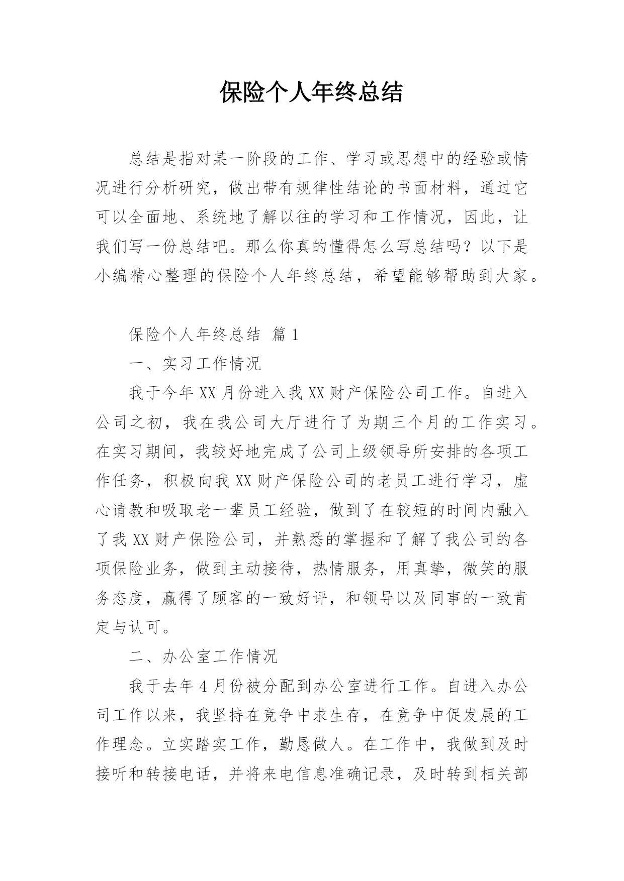 保险个人年终总结总结是指对某一阶段的工作、学习或思想中的经验或情况进行分析研究,做出带有规律性结论的书面材料,通过它可以全面地、系统地了解以往的学习和工作情况,因此,让我们写一份总结吧。那么你真的懂得怎么写总结吗?以下是小编精心整理的保险个人年终总结,希望能够帮助到大家。保险个人年终总结篇1一、实习工作情况我于今年XX月份进入我XX财产保险公司工作。自进入公司之初,我在我公司大厅进行了为期三个月的工作实习。在实习期间,我较好地完成了公司上级领导所安排的各项工作任务,积极向我XX财产保险公司的老员工进行学习