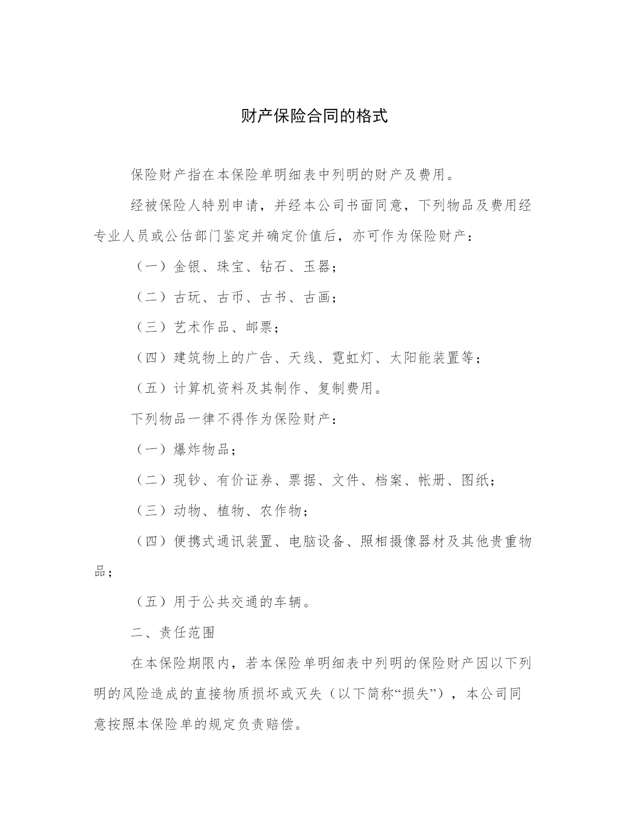财产保险合同的格式保险财产指在本保险单明细表中列明的财产及费用。经被保险人特别申请,并经本公司书面同意,下列物品及费用经专业人员或公估部门鉴定并确定价值后,亦可作为保险财产:(一)金银、珠宝、钻石、玉器;(二)古玩、古币、古书、古画;(三)艺术作品、邮票;(四)建筑物上的广告、天线、霓虹灯、太阳能装置等;(五)计算机资料及其制作、复制费用。下列物品一律不得作为保险财产:(一)爆炸物品;(二)现钞、有价证券、票据、文件、档案、帐册、图纸;(三)动物、植物、农作物;(四)便携式通讯装置、电脑设备、照相摄像器材