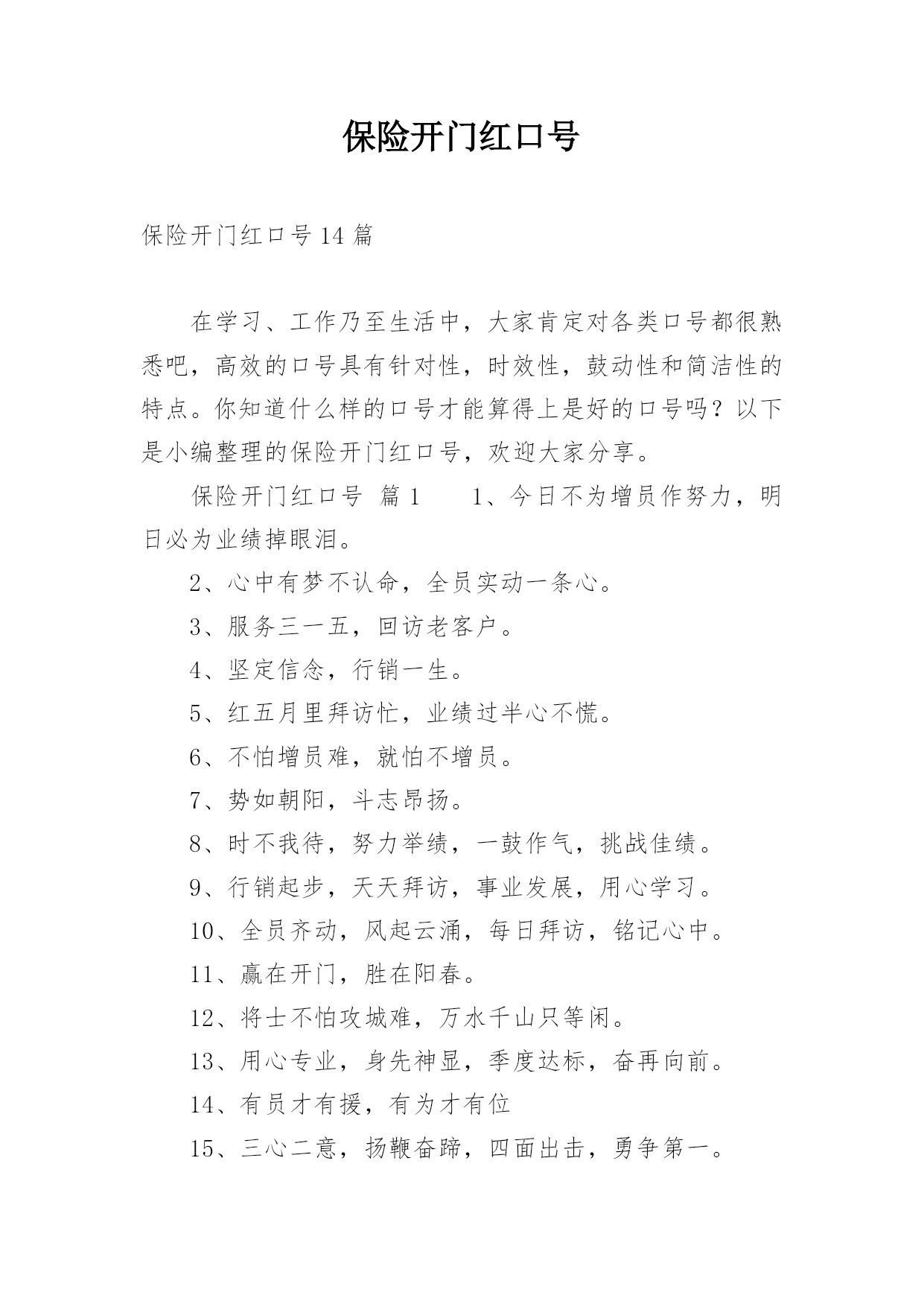 保险开门红口号保险开门红口号14篇在学习、工作乃至生活中,大家肯定对各类口号都很熟悉吧,高效的口号具有针对性,时效性,鼓动性和简洁性的特点。你知道什么样的口号才能算得上是好的口号吗?以下是小编整理的保险开门红口号,欢迎大家分享。保险开门红口号篇11、今日不为增员作努力,明日必为业绩掉眼泪。2、心中有梦不认命,全员实动一条心。3、服务三一五,回访老客户。4、坚定信念,行销一生。5、红五月里拜访忙,业绩过半心不慌。6、不怕增员难,就怕不增员。7、势如朝阳,斗志昂扬。8、时不我待,努力举绩,一鼓作气,挑战佳绩。