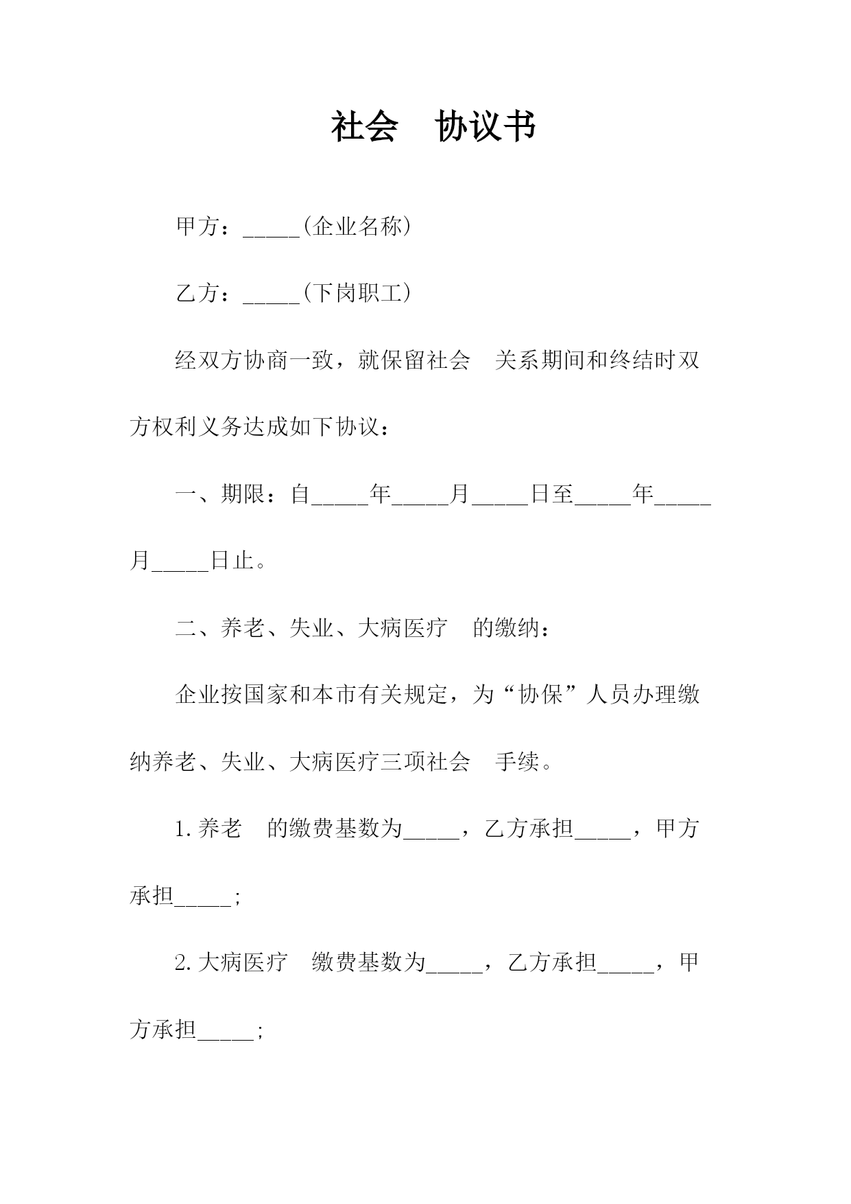 社会协议书甲方:_____(企业名称)乙方:_____(下岗职工)经双方协商一致,就保留社会关系期间和终结时双方权利义务达成如下协议:一、期限:自_____年_____月_____日至_____年_____月_____日止。二、养老、失业、大病医疗的缴纳:企业按国家和本市有关规定,为“协保”人员办理缴纳养老、失业、大病医疗三项社会手续。1.养老的缴费基数为_____,乙方承担_____,甲方承担_____;2.大病医疗缴费基数为_____,乙方承担_____,甲方承担_____;3.失业费缴纳_____,
