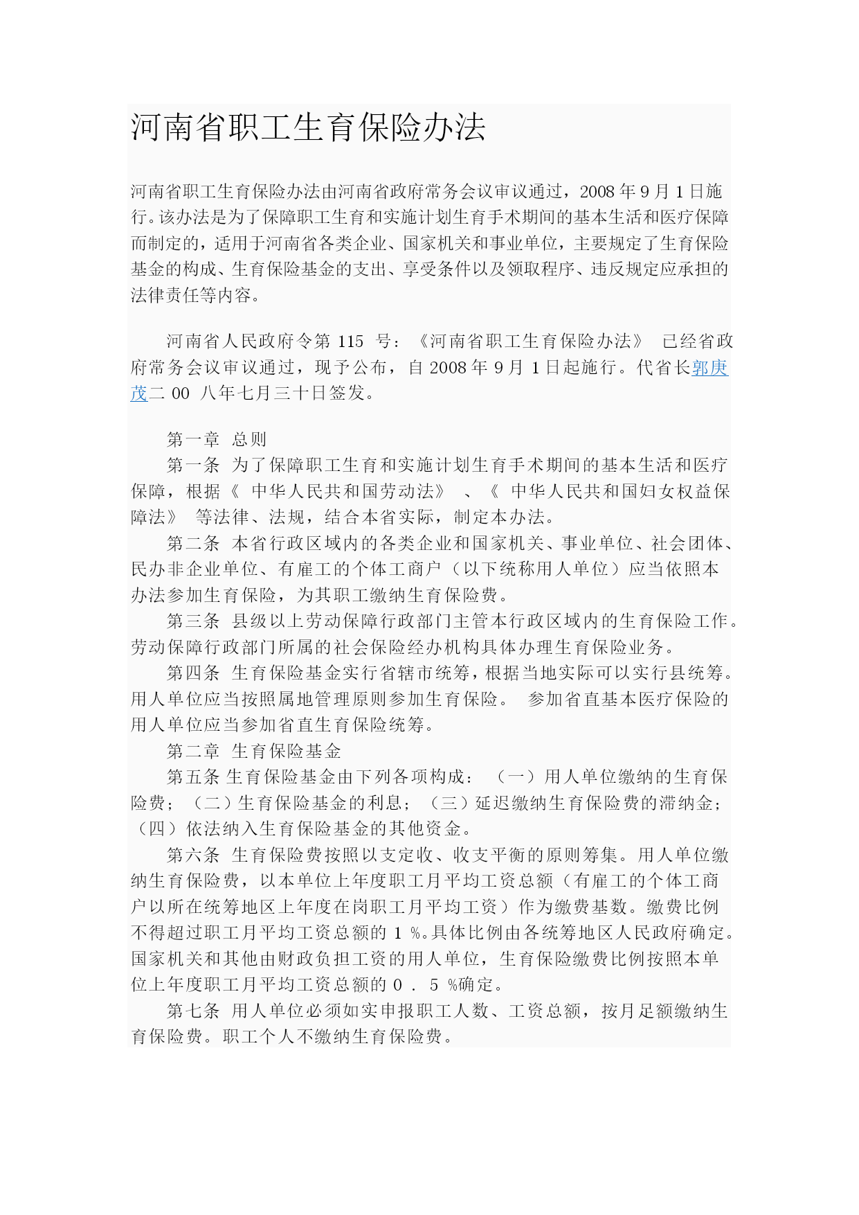 河南省职工生育保险办法河南省职工生育保险办法由河南省政府常务会议审议通过,2008年9月1日施行。该办法是为了保障职工生育和实施计划生育手术期间的基本生活和医疗保障而制定的,适用于河南省各类企业、国家机关和事业单位,主要规定了生育保险基金的构成、生育保险基金的支出、享受条件以及领取程序、违反规定应承担的法律责任等内容。河南省人民政府令第115号:《河南省职工生育保险办法》已经省政府常务会议审议通过,现予公布,自2008年9月1日起施行。代省长HYPERLINK"http://baike.baidu.co