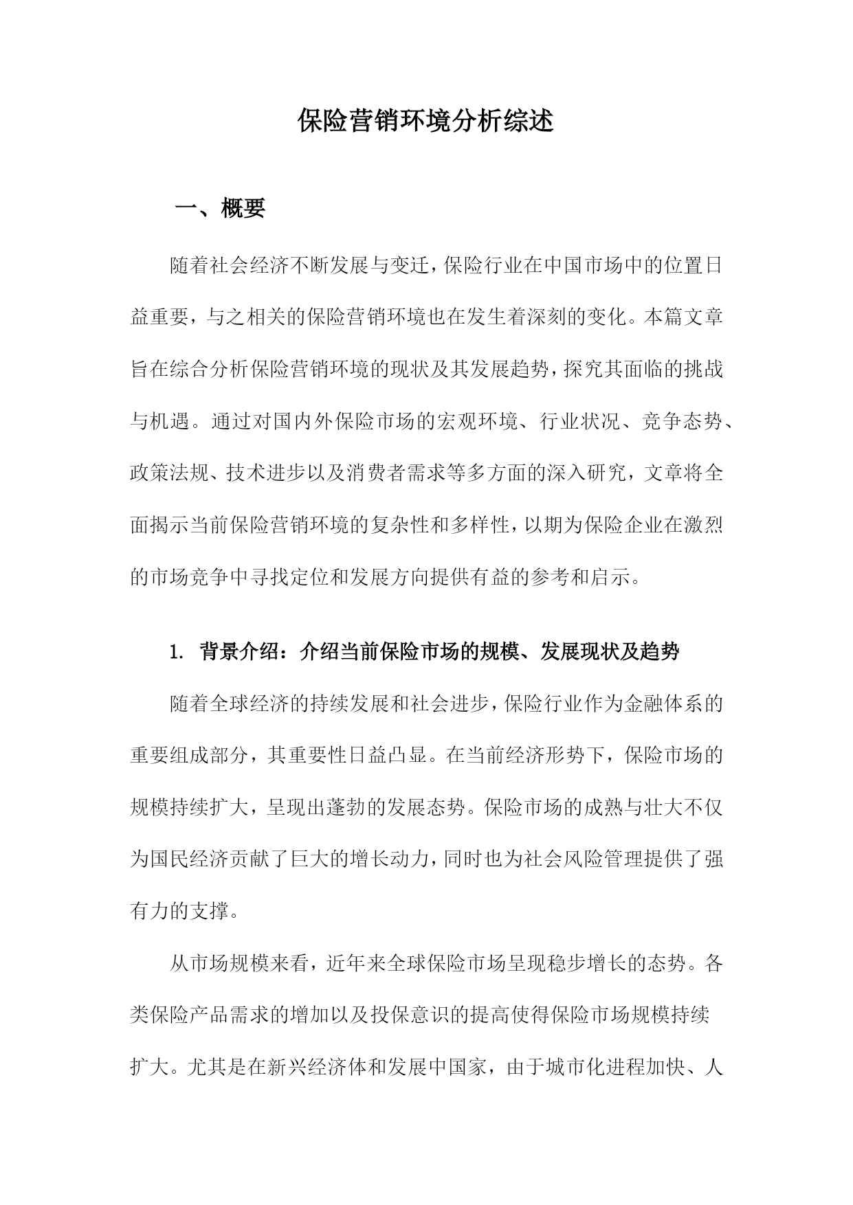 保险营销环境分析综述一、概要随着社会经济不断发展与变迁,保险行业在中国市场中的位置日益重要,与之相关的保险营销环境也在发生着深刻的变化。本篇文章旨在综合分析保险营销环境的现状及其发展趋势,探究其面临的挑战与机遇。通过对国内外保险市场的宏观环境、行业状况、竞争态势、政策法规、技术进步以及消费者需求等多方面的深入研究,文章将全面揭示当前保险营销环境的复杂性和多样性,以期为保险企业在激烈的市场竞争中寻找定位和发展方向提供有益的参考和启示。1.背景介绍:介绍当前保险市场的规模、发展现状及趋势随着全球经济的持续发展