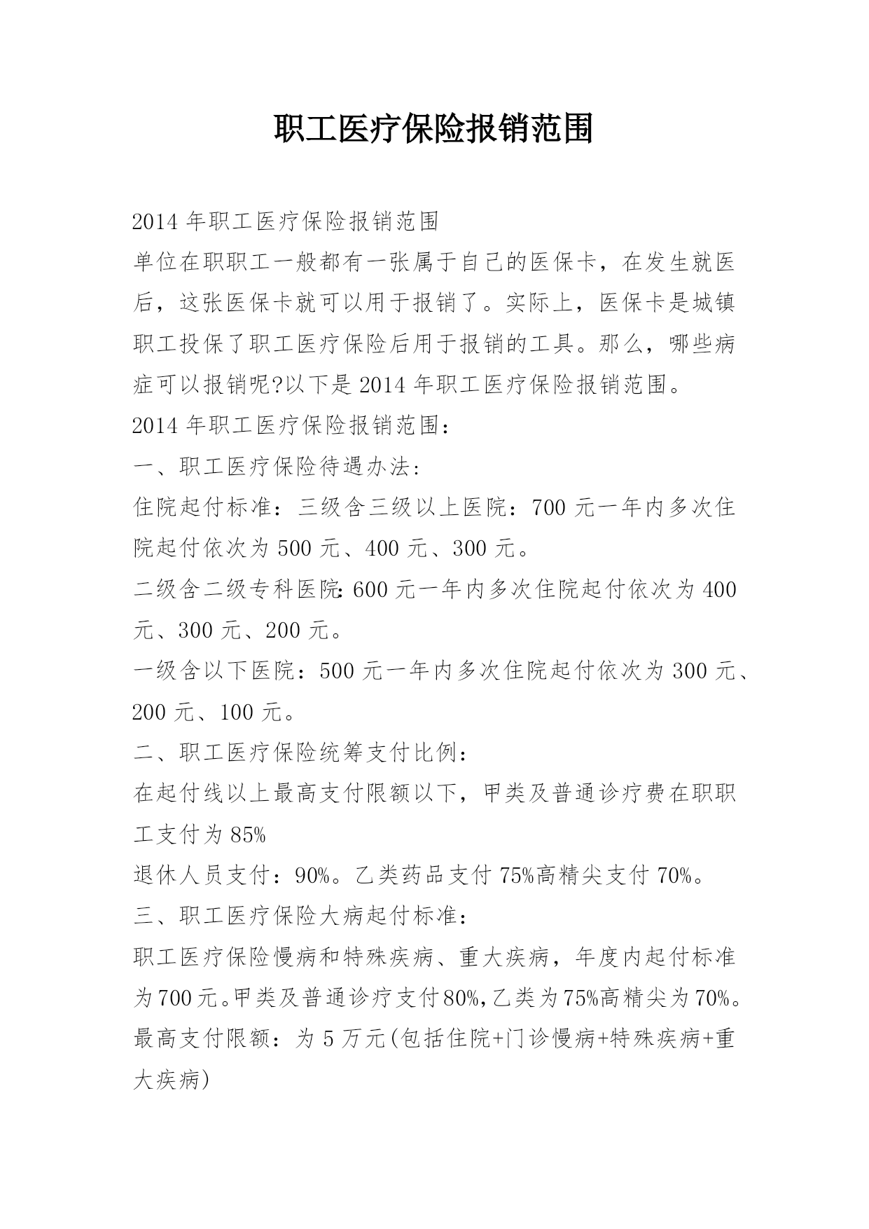 职工医疗保险报销范围2014年职工医疗保险报销范围单位在职职工一般都有一张属于自己的医保卡,在发生就医后,这张医保卡就可以用于报销了。实际上,医保卡是城镇职工投保了职工医疗保险后用于报销的工具。那么,哪些病症可以报销呢?以下是2014年职工医疗保险报销范围。2014年职工医疗保险报销范围:一、职工医疗保险待遇办法:住院起付标准:三级含三级以上医院:700元一年内多次住院起付依次为500元、400元、300元。二级含二级专科医院:600元一年内多次住院起付依次为400元、300元、200元。一级含以下医院: