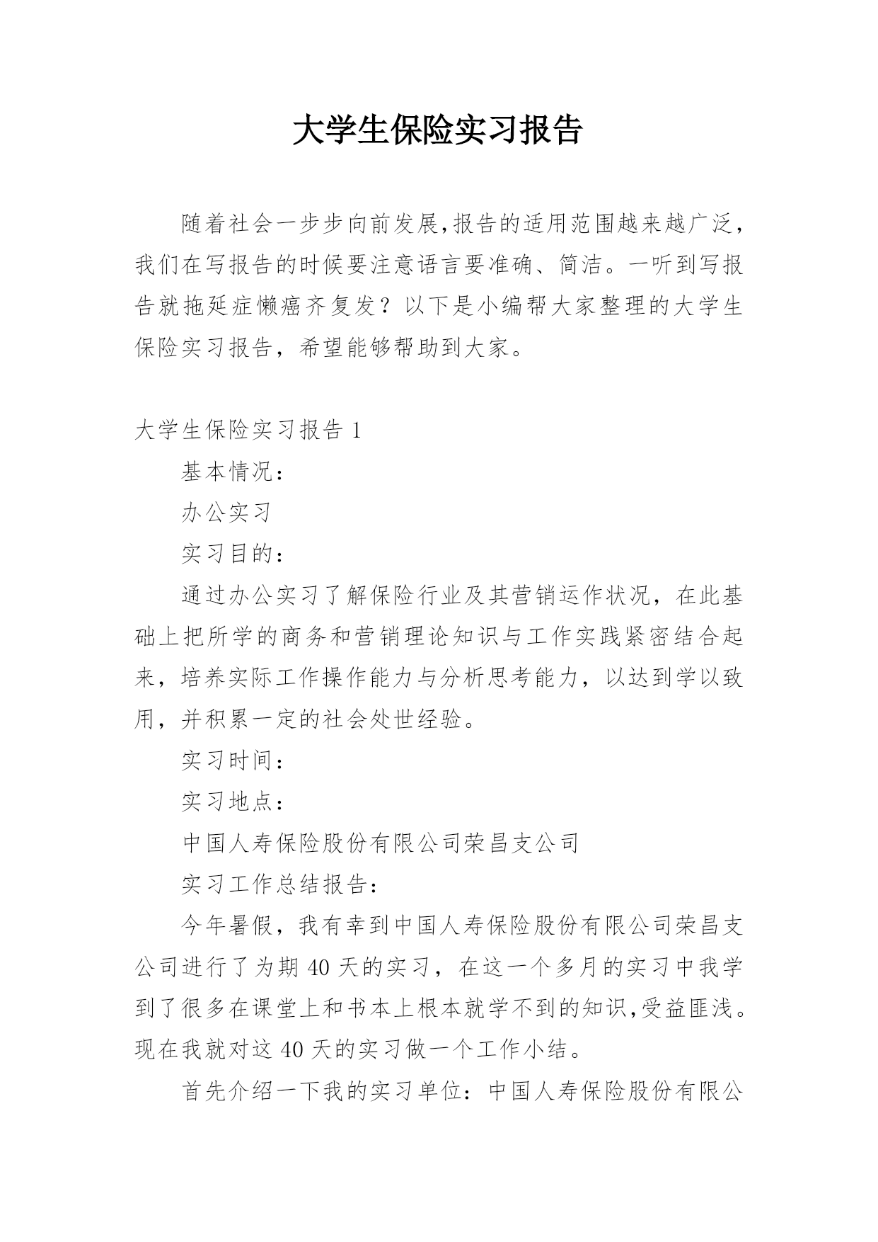 大学生保险实习报告随着社会一步步向前发展,报告的适用范围越来越广泛,我们在写报告的时候要注意语言要准确、简洁。一听到写报告就拖延症懒癌齐复发?以下是小编帮大家整理的大学生保险实习报告,希望能够帮助到大家。大学生保险实习报告1基本情况:办公实习实习目的:通过办公实习了解保险行业及其营销运作状况,在此基础上把所学的商务和营销理论知识与工作实践紧密结合起来,培养实际工作操作能力与分析思考能力,以达到学以致用,并积累一定的社会处世经验。实习时间:实习地点:中国人寿保险股份有限公司荣昌支公司实习工作总结报告:今年暑