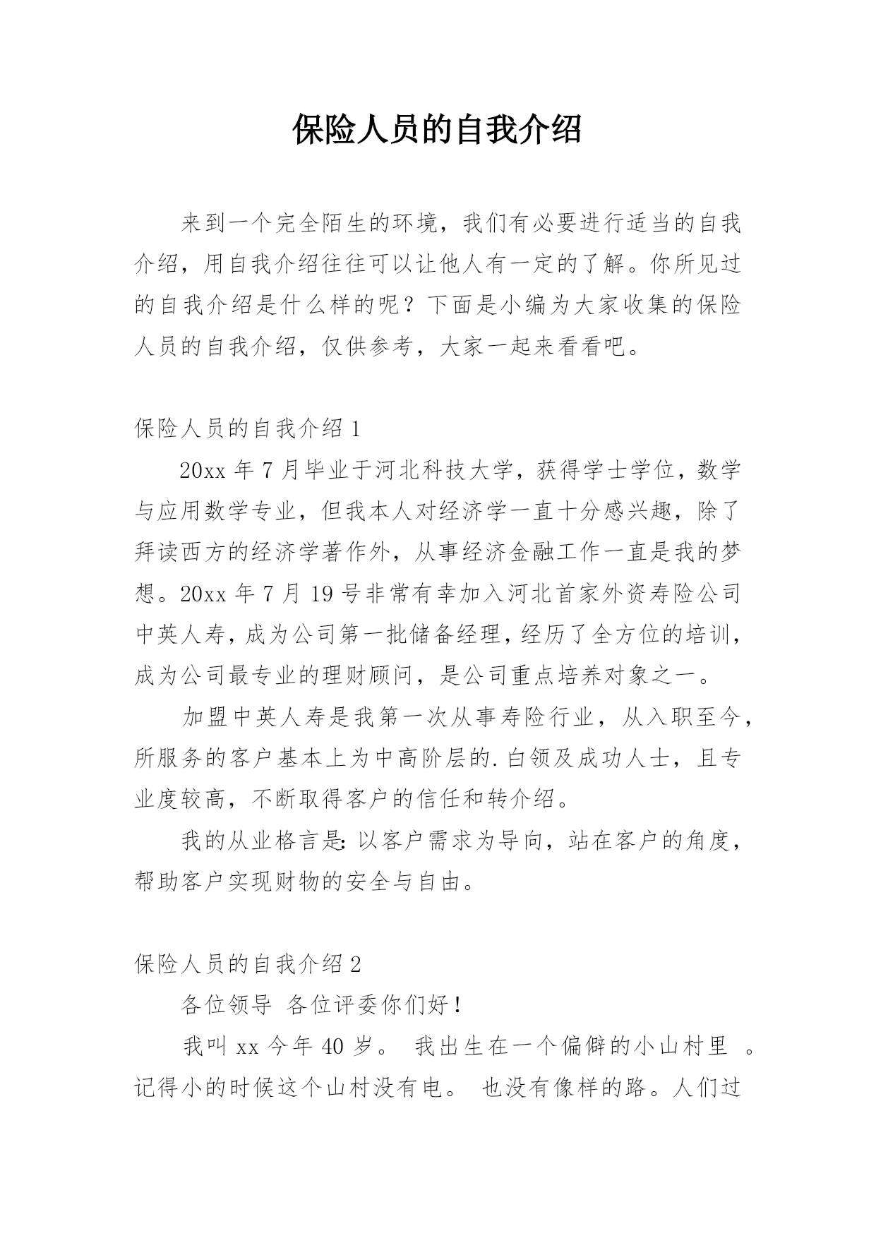 保险人员的自我介绍来到一个完全陌生的环境,我们有必要进行适当的自我介绍,用自我介绍往往可以让他人有一定的了解。你所见过的自我介绍是什么样的呢?下面是小编为大家收集的保险人员的自我介绍,仅供参考,大家一起来看看吧。保险人员的自我介绍120xx年7月毕业于河北科技大学,获得学士学位,数学与应用数学专业,但我本人对经济学一直十分感兴趣,除了拜读西方的经济学著作外,从事经济金融工作一直是我的梦想。20xx年7月19号非常有幸加入河北首家外资寿险公司中英人寿,成为公司第一批储备经理,经历了全方位的培训,成为公司最专