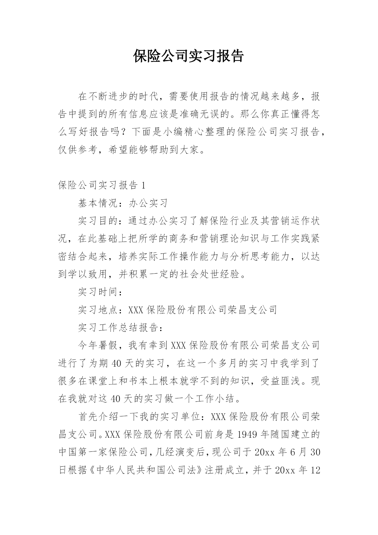 保险公司实习报告在不断进步的时代,需要使用报告的情况越来越多,报告中提到的所有信息应该是准确无误的。那么你真正懂得怎么写好报告吗?下面是小编精心整理的保险公司实习报告,仅供参考,希望能够帮助到大家。保险公司实习报告1基本情况:办公实习实习目的:通过办公实习了解保险行业及其营销运作状况,在此基础上把所学的商务和营销理论知识与工作实践紧密结合起来,培养实际工作操作能力与分析思考能力,以达到学以致用,并积累一定的社会处世经验。实习时间:实习地点:XXX保险股份有限公司荣昌支公司实习工作总结报告:今年暑假,我有幸