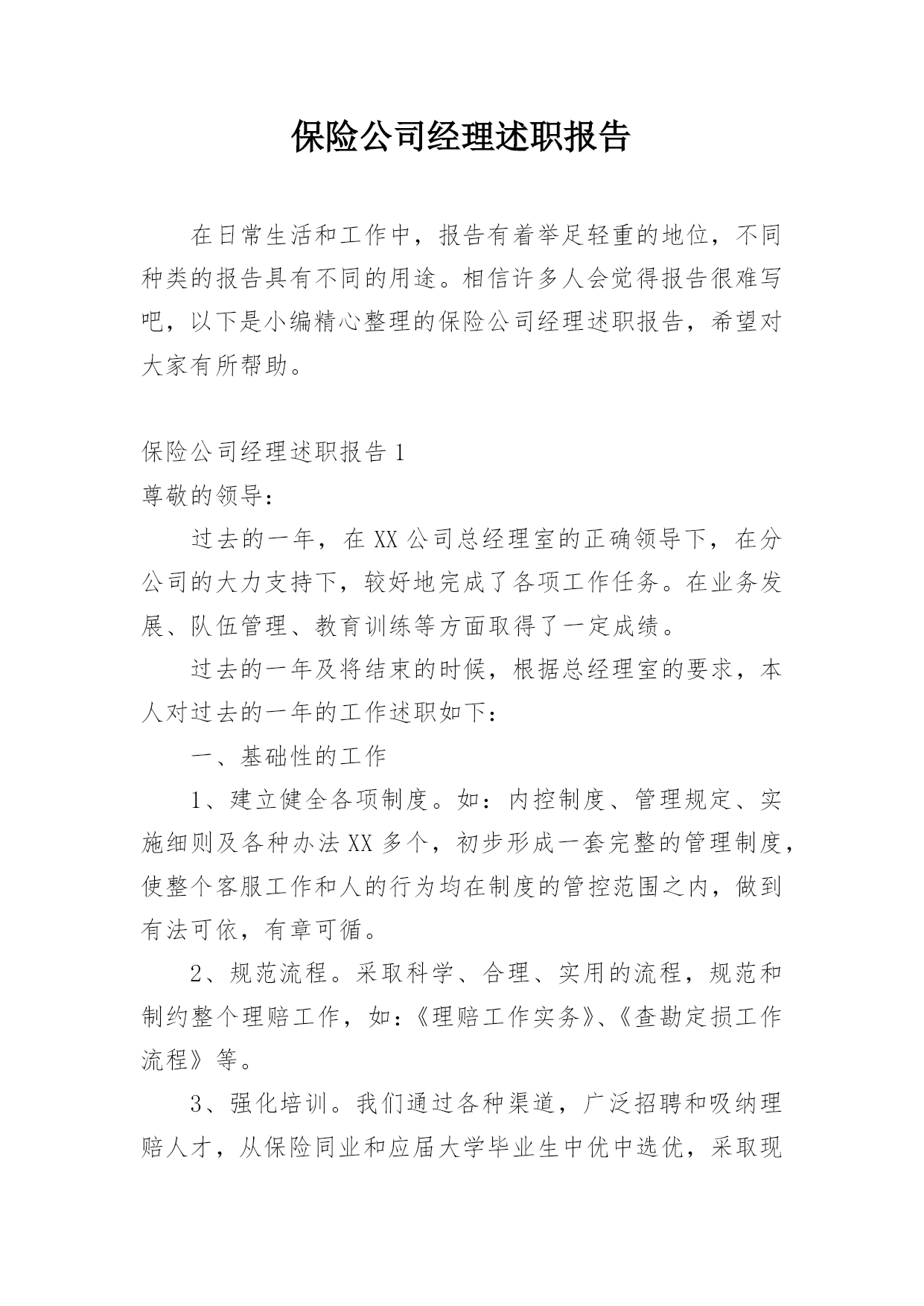 保险公司经理述职报告在日常生活和工作中,报告有着举足轻重的地位,不同种类的报告具有不同的用途。相信许多人会觉得报告很难写吧,以下是小编精心整理的保险公司经理述职报告,希望对大家有所帮助。保险公司经理述职报告1尊敬的领导:过去的一年,在XX公司总经理室的正确领导下,在分公司的大力支持下,较好地完成了各项工作任务。在业务发展、队伍管理、教育训练等方面取得了一定成绩。过去的一年及将结束的时候,根据总经理室的要求,本人对过去的一年的工作述职如下:一、基础性的工作1、建立健全各项制度。如:内控制度、管理规定、实施细