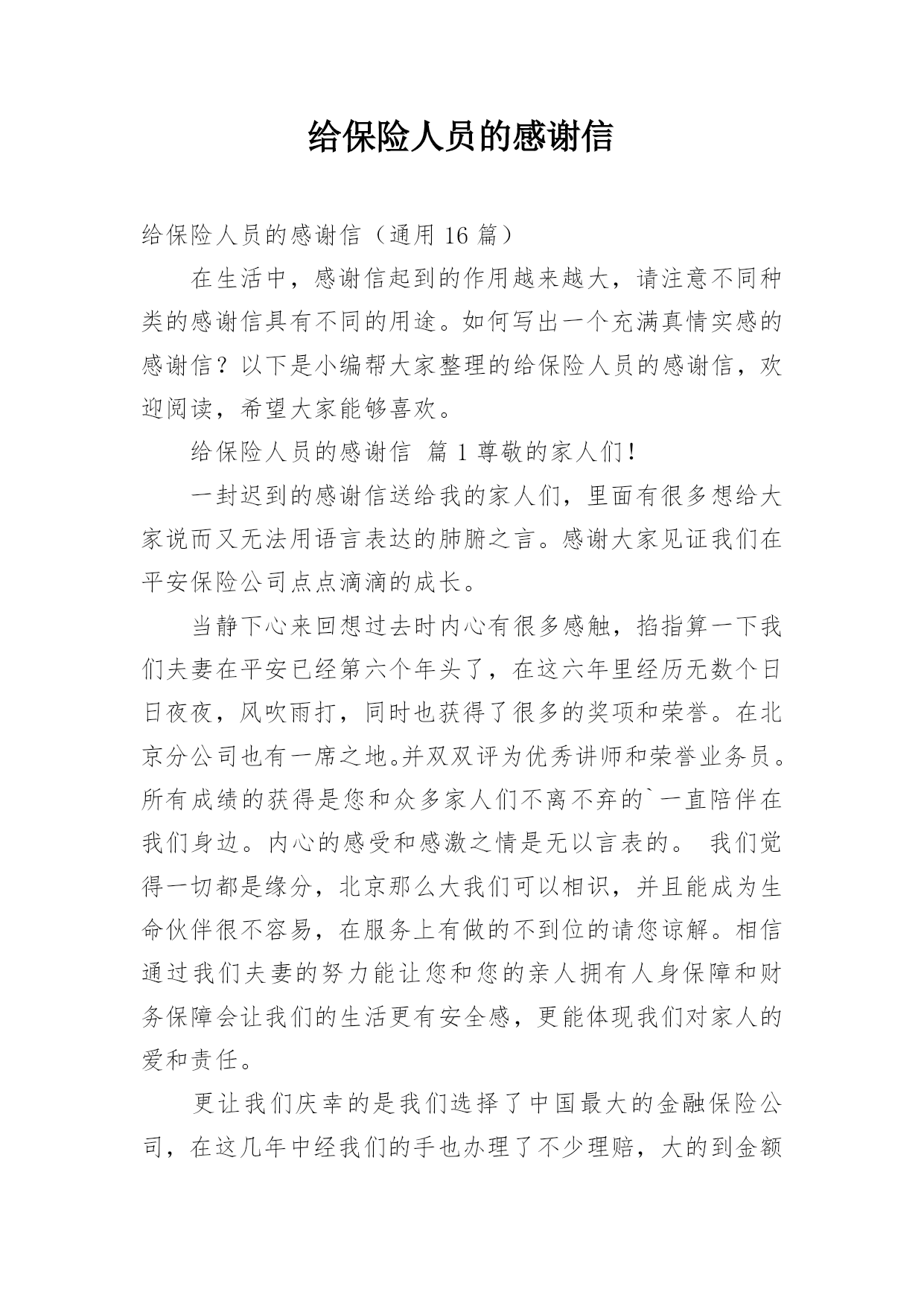 给保险人员的感谢信给保险人员的感谢信(通用16篇)在生活中,感谢信起到的作用越来越大,请注意不同种类的感谢信具有不同的用途。如何写出一个充满真情实感的感谢信?以下是小编帮大家整理的给保险人员的感谢信,欢迎阅读,希望大家能够喜欢。给保险人员的感谢信篇1尊敬的家人们!一封迟到的感谢信送给我的家人们,里面有很多想给大家说而又无法用语言表达的肺腑之言。感谢大家见证我们在平安保险公司点点滴滴的成长。当静下心来回想过去时内心有很多感触,掐指算一下我们夫妻在平安已经第六个年头了,在这六年里经历无数个日日夜夜,风吹雨打,