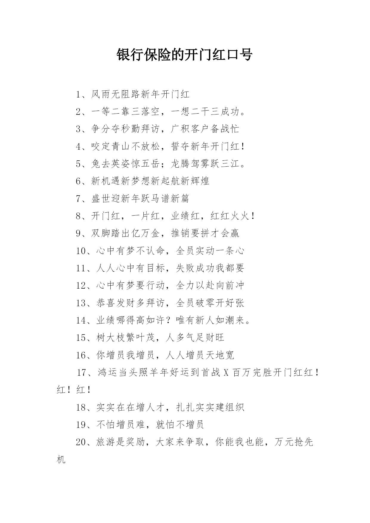 银行保险的开门红口号1、风雨无阻路新年开门红2、一等二靠三落空,一想二干三成功。3、争分夺秒勤拜访,广积客户备战忙4、咬定青山不放松,誓夺新年开门红!5、兔去英姿惊五岳;龙腾驾雾跃三江。6、新机遇新梦想新起航新辉煌7、盛世迎新年跃马谱新篇8、开门红,一片红,业绩红,红红火火!9、双脚踏出亿万金,推销要拼才会赢10、心中有梦不认命,全员实动一条心11、人人心中有目标,失败成功我都要12、心中有梦要行动,全力以赴向前冲13、恭喜发财多拜访,全员破零开好张14、业绩哪得高如许?唯有新人如潮来。15、树大枝繁叶茂
