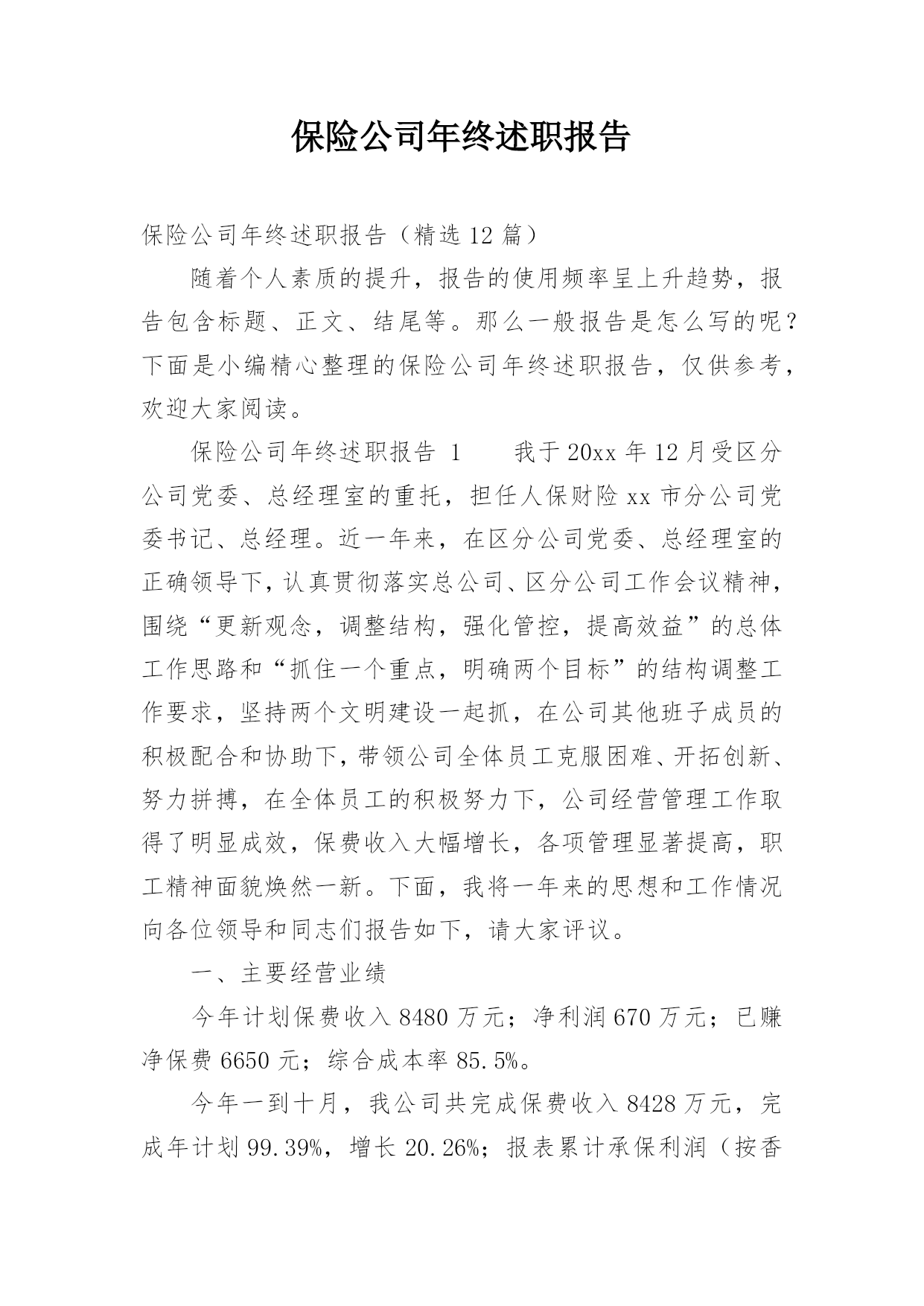 保险公司年终述职报告保险公司年终述职报告(精选12篇)随着个人素质的提升,报告的使用频率呈上升趋势,报告包含标题、正文、结尾等。那么一般报告是怎么写的呢?下面是小编精心整理的保险公司年终述职报告,仅供参考,欢迎大家阅读。保险公司年终述职报告1我于20xx年12月受区分公司党委、总经理室的重托,担任人保财险xx市分公司党委书记、总经理。近一年来,在区分公司党委、总经理室的正确领导下,认真贯彻落实总公司、区分公司工作会议精神,围绕“更新观念,调整结构,强化管控,提高效益”的总体工作思路和“抓住一个重点,明确两