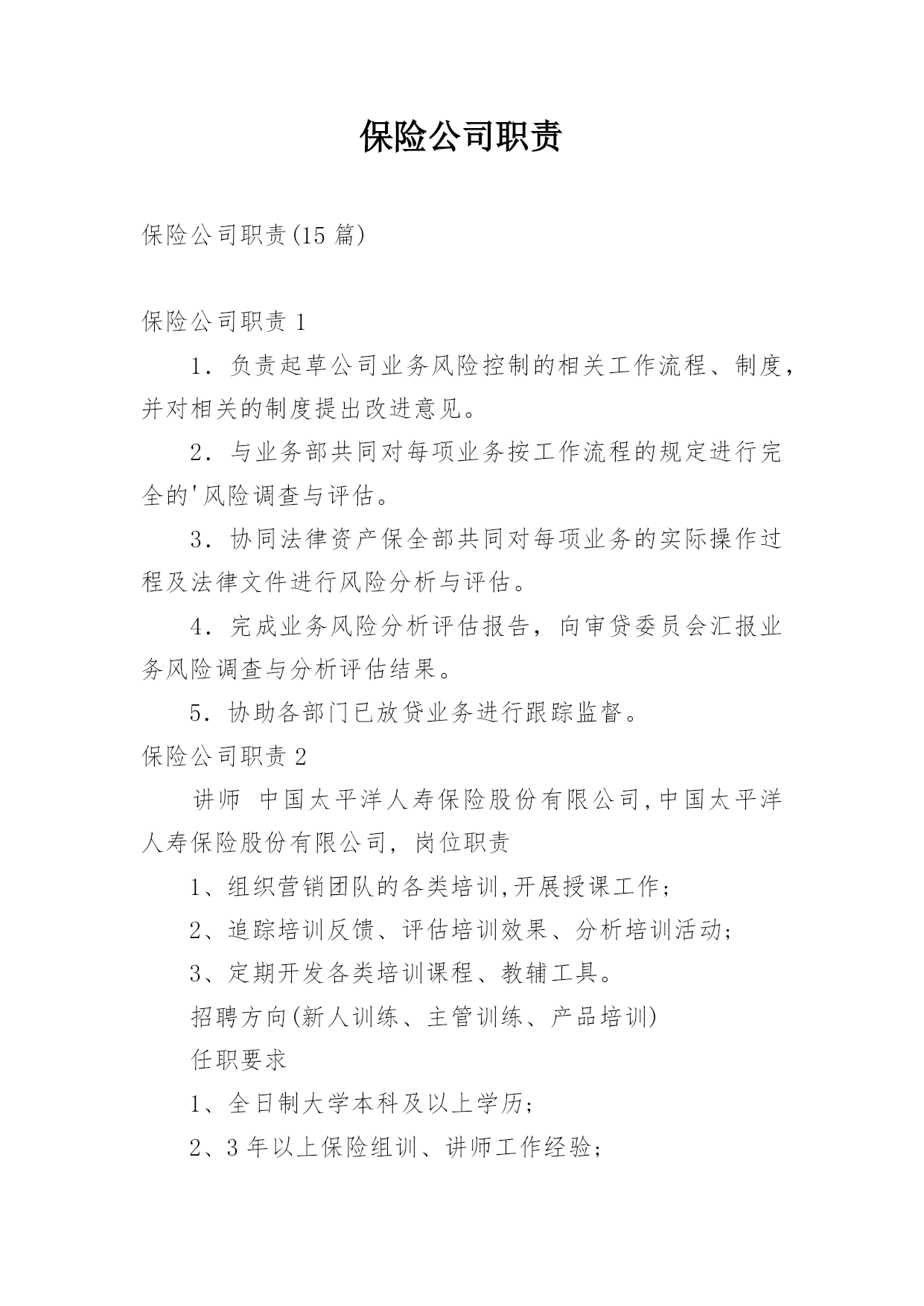 保险公司职责保险公司职责(15篇)保险公司职责11.负责起草公司业务风险控制的相关工作流程、制度,并对相关的制度提出改进意见。2.与业务部共同对每项业务按工作流程的规定进行完全的'风险调查与评估。3.协同法律资产保全部共同对每项业务的实际操作过程及法律文件进行风险分析与评估。4.完成业务风险分析评估报告,向审贷委员会汇报业务风险调查与分析评估结果。5.协助各部门已放贷业务进行跟踪监督。保险公司职责2讲师中国太平洋人寿保险股份有限公司,中国太平洋人寿保险股份有限公司,岗位职责1、组织营销团队的各类培训,开展