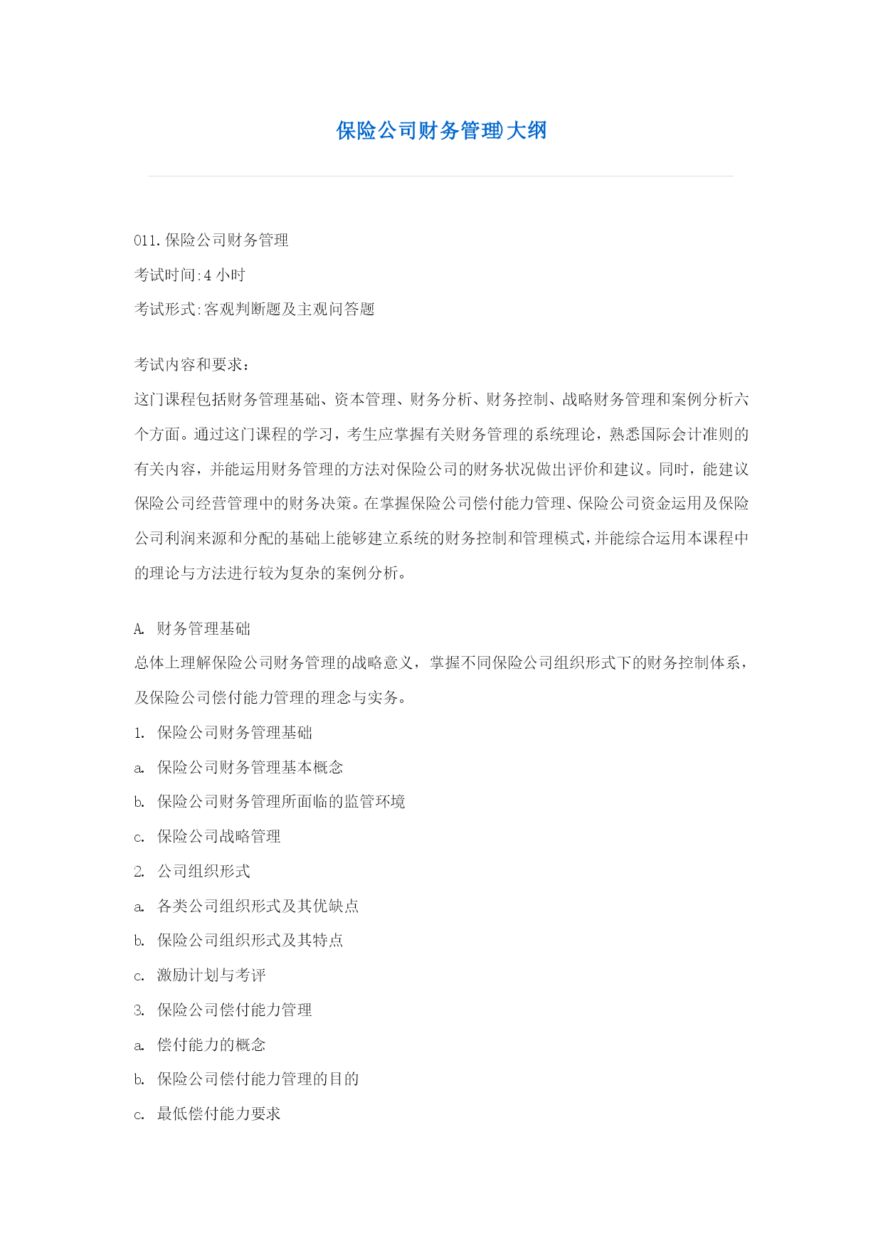 保险公司财务管理)大纲011.保险公司财务管理考试时间:4小时考试形式:客观判断题及主观问答题考试内容和要求:这门课程包括财务管理基础、资本管理、财务分析、财务控制、战略财务管理和案例分析六个方面。通过这门课程的学习,考生应掌握有关财务管理的系统理论,熟悉国际会计准则的有关内容,并能运用财务管理的方法对保险公司的财务状况做出评价和建议。同时,能建议保险公司经营管理中的财务决策。在掌握保险公司偿付能力管理、保险公司资金运用及保险公司利润来源和分配的基础上能够建立系统的财务控制和管理模式,并能综合运用本课程中