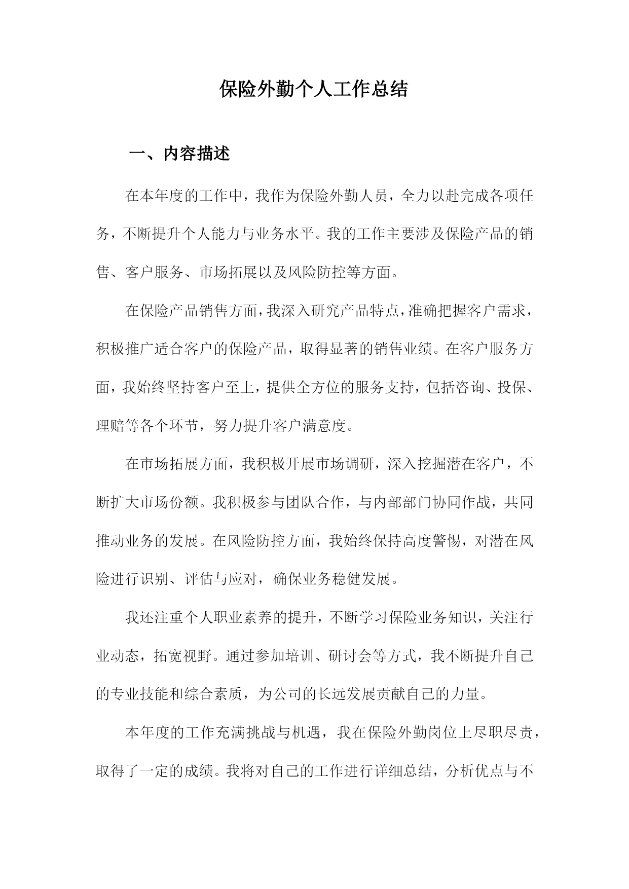 保险外勤个人工作总结一、内容描述在本年度的工作中,我作为保险外勤人员,全力以赴完成各项任务,不断提升个人能力与业务水平。我的工作主要涉及保险产品的销售、客户服务、市场拓展以及风险防控等方面。在保险产品销售方面,我深入研究产品特点,准确把握客户需求,积极推广适合客户的保险产品,取得显著的销售业绩。在客户服务方面,我始终坚持客户至上,提供全方位的服务支持,包括咨询、投保、理赔等各个环节,努力提升客户满意度。在市场拓展方面,我积极开展市场调研,深入挖掘潜在客户,不断扩大市场份额。我积极参与团队合作,与内部部门协