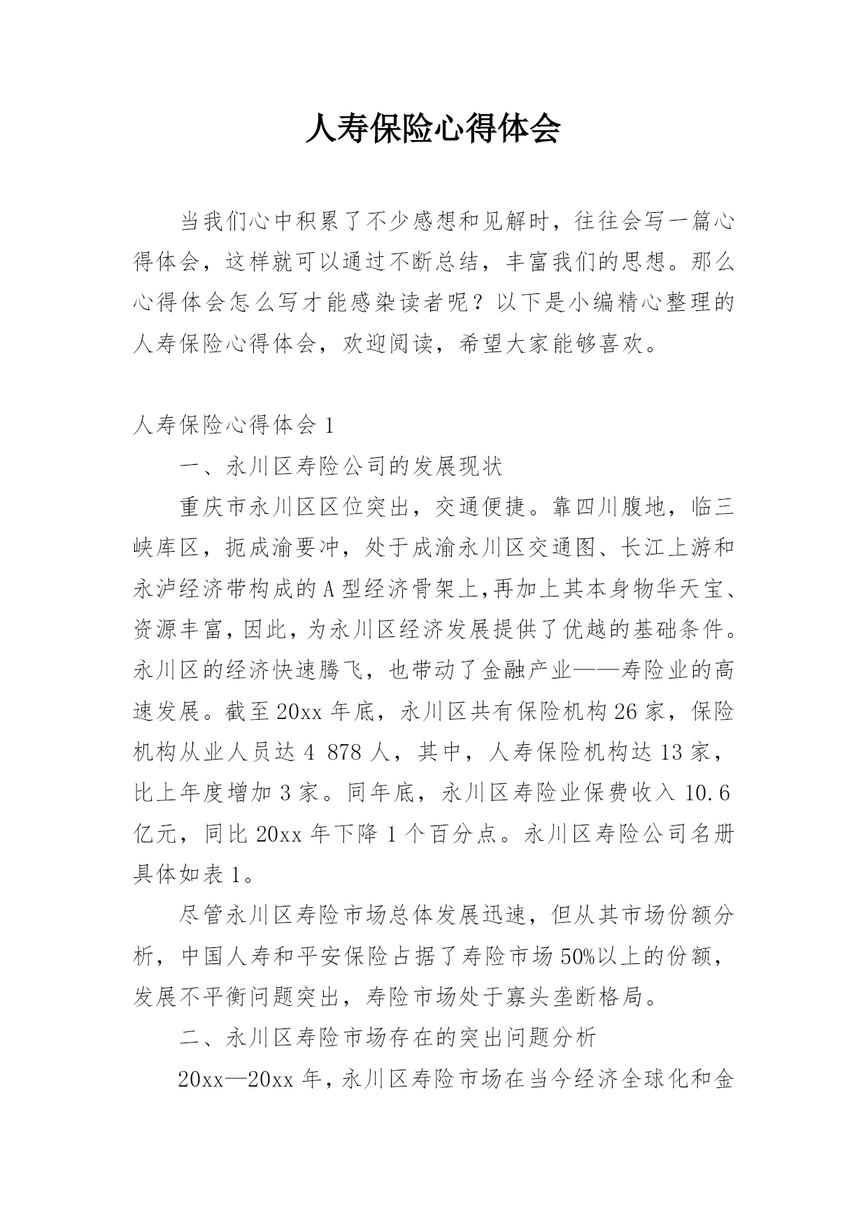 人寿保险心得体会当我们心中积累了不少感想和见解时,往往会写一篇心得体会,这样就可以通过不断总结,丰富我们的思想。那么心得体会怎么写才能感染读者呢?以下是小编精心整理的人寿保险心得体会,欢迎阅读,希望大家能够喜欢。人寿保险心得体会1一、永川区寿险公司的发展现状重庆市永川区区位突出,交通便捷。靠四川腹地,临三峡库区,扼成渝要冲,处于成渝永川区交通图、长江上游和永泸经济带构成的A型经济骨架上,再加上其本身物华天宝、资源丰富,因此,为永川区经济发展提供了优越的基础条件。永川区的经济快速腾飞,也带动了金融产业——寿