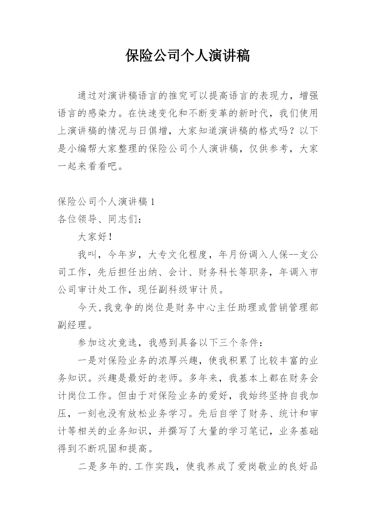 保险公司个人演讲稿通过对演讲稿语言的推究可以提高语言的表现力,增强语言的感染力。在快速变化和不断变革的新时代,我们使用上演讲稿的情况与日俱增,大家知道演讲稿的格式吗?以下是小编帮大家整理的保险公司个人演讲稿,仅供参考,大家一起来看看吧。保险公司个人演讲稿1各位领导、同志们:大家好!我叫,今年岁,大专文化程度,年月份调入人保--支公司工作,先后担任出纳、会计、财务科长等职务,年调入市公司审计处工作,现任副科级审计员。今天,我竞争的岗位是财务中心主任助理或营销管理部副经理。参加这次竞选,我感到具备以下三个条件