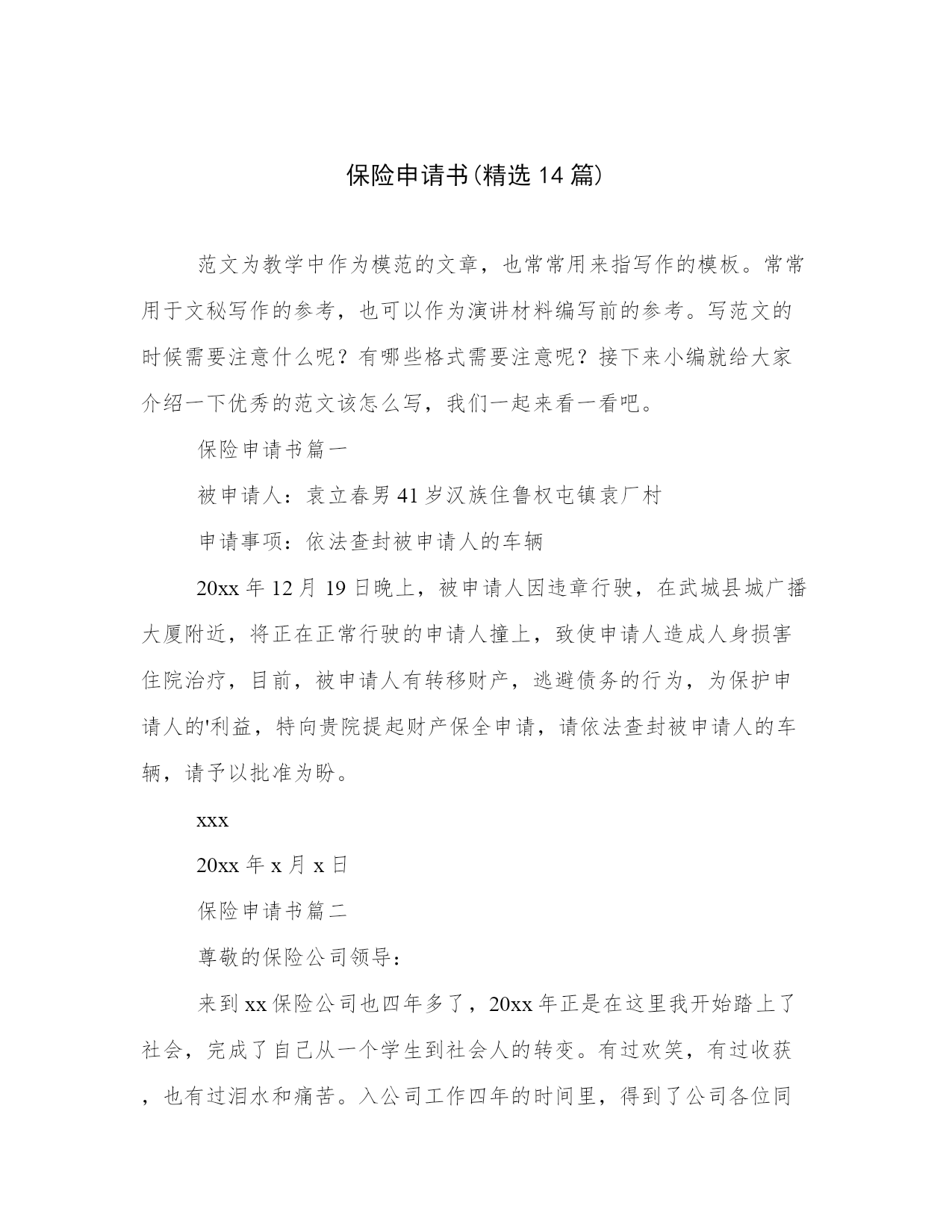保险申请书(精选14篇)范文为教学中作为模范的文章,也常常用来指写作的模板。常常用于文秘写作的参考,也可以作为演讲材料编写前的参考。写范文的时候需要注意什么呢?有哪些格式需要注意呢?接下来小编就给大家介绍一下优秀的范文该怎么写,我们一起来看一看吧。保险申请书篇一被申请人:袁立春男41岁汉族住鲁权屯镇袁厂村申请事项:依法查封被申请人的车辆20xx年12月19日晚上,被申请人因违章行驶,在武城县城广播大厦附近,将正在正常行驶的申请人撞上,致使申请人造成人身损害住院治疗,目前,被申请人有转移财产,逃避债务的行为