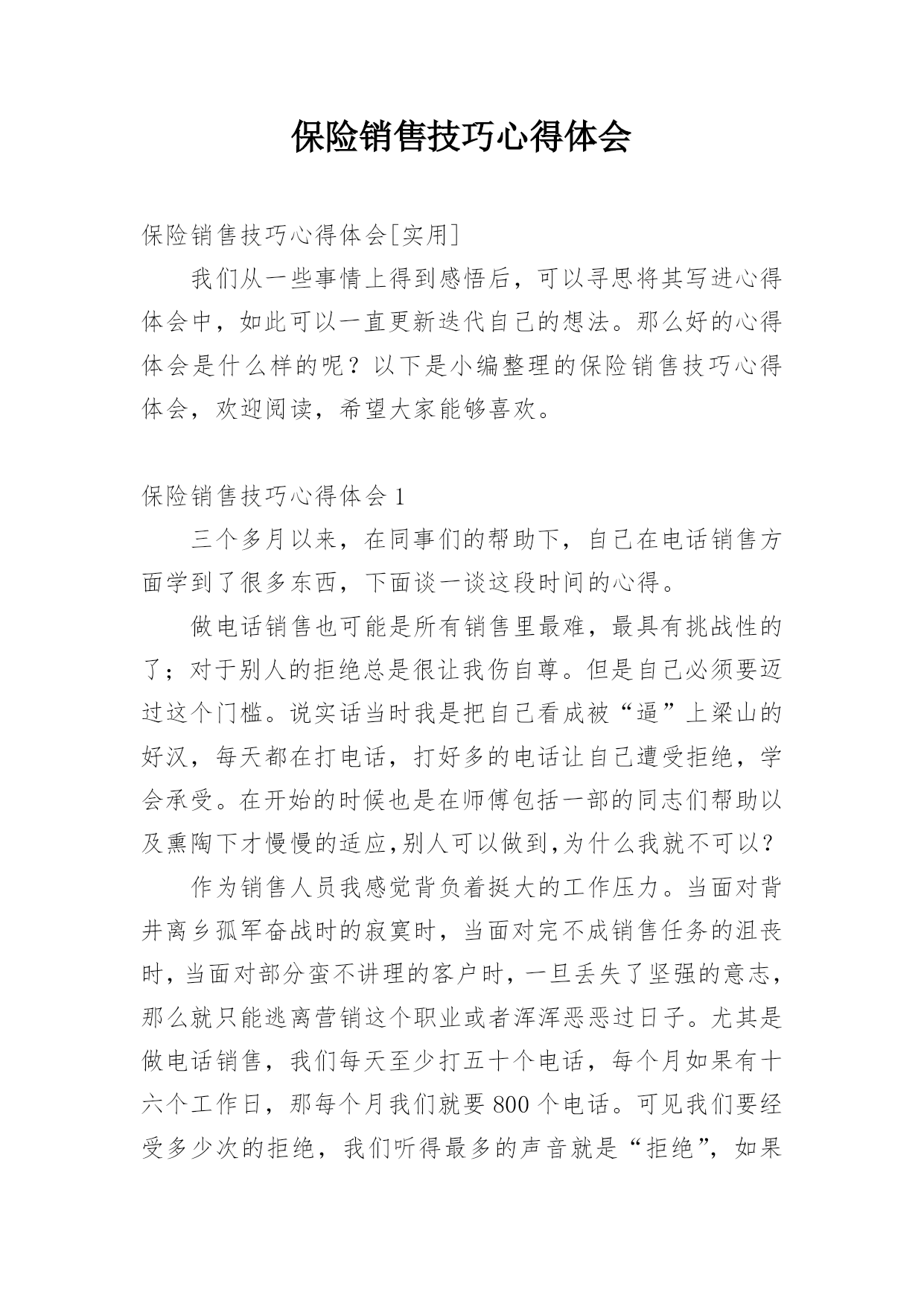 保险销售技巧心得体会保险销售技巧心得体会[实用]我们从一些事情上得到感悟后,可以寻思将其写进心得体会中,如此可以一直更新迭代自己的想法。那么好的心得体会是什么样的呢?以下是小编整理的保险销售技巧心得体会,欢迎阅读,希望大家能够喜欢。保险销售技巧心得体会1三个多月以来,在同事们的帮助下,自己在电话销售方面学到了很多东西,下面谈一谈这段时间的心得。做电话销售也可能是所有销售里最难,最具有挑战性的了;对于别人的拒绝总是很让我伤自尊。但是自己必须要迈过这个门槛。说实话当时我是把自己看成被“逼”上梁山的好汉,每天都