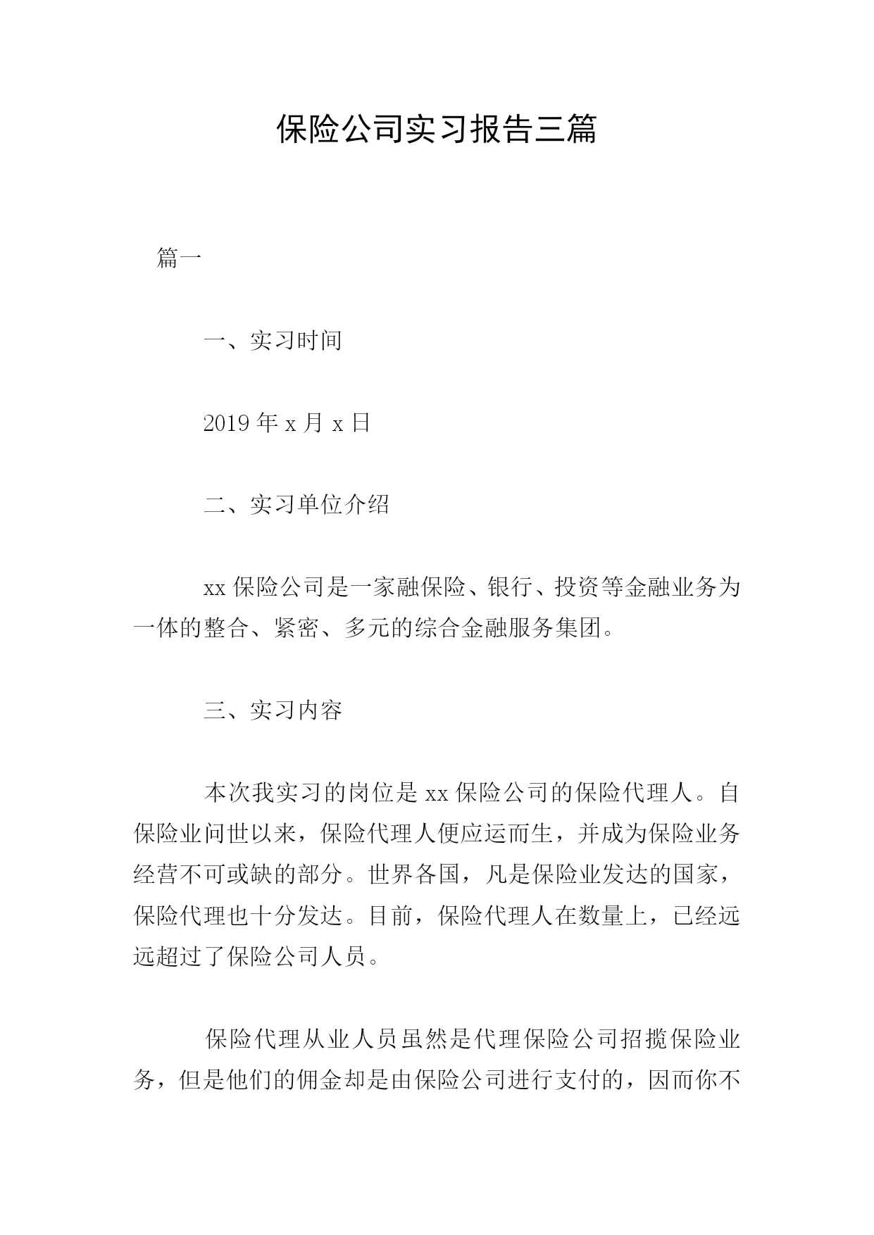 保险公司实习报告三篇篇一一、实习时间2019年x月x日二、实习单位介绍xx保险公司是一家融保险、银行、投资等金融业务为一体的整合、紧密、多元的综合金融服务集团。三、实习内容本次我实习的岗位是xx保险公司的保险代理人。自保险业问世以来,保险代理人便应运而生,并成为保险业务经营不可或缺的部分。世界各国,凡是保险业发达的国家,保险代理也十分发达。目前,保险代理人在数量上,已经远远超过了保险公司人员。保险代理从业人员虽然是代理保险公司招揽保险业务,但是他们的佣金却是由保险公司进行支付的,因而你不用担心代理人再会额