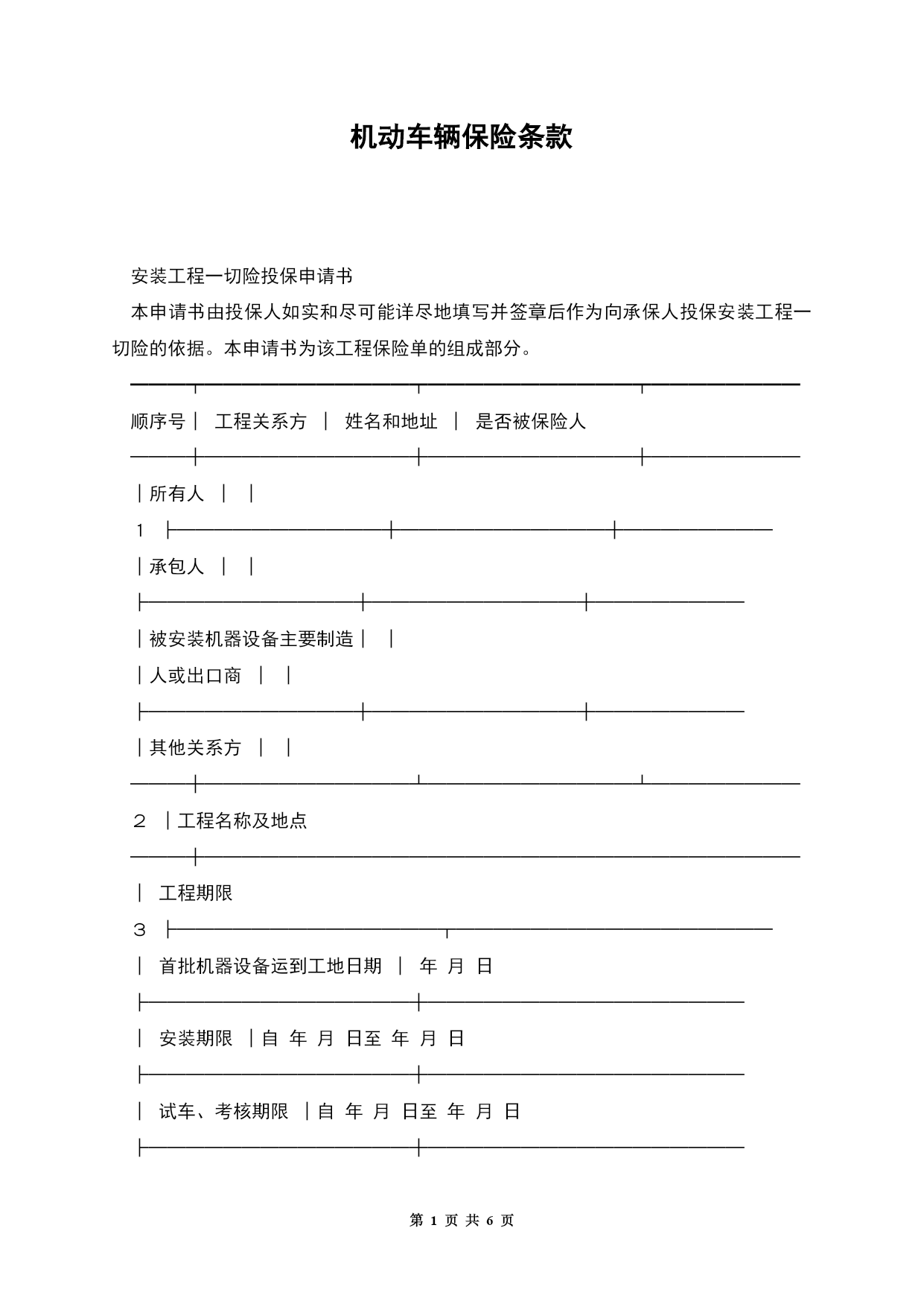 第PAGE\*MERGEFORMAT6页共NUMPAGES\*MERGEFORMAT6页机动车辆保险条款安装工程一切险投保申请书本申请书由投保人如实和尽可能详尽地填写并签章后作为向承保人投保安装工程一切险的依据。本申请书为该工程保险单的组成部分。━━━┯━━━━━━━━━━━┯━━━━━━━━━━━┯━━━━━━━━顺序号│工程关系方│姓名和地址│是否被保险人───┼───────────┼───────────┼────────│所有人││1├───────────┼───────────┼