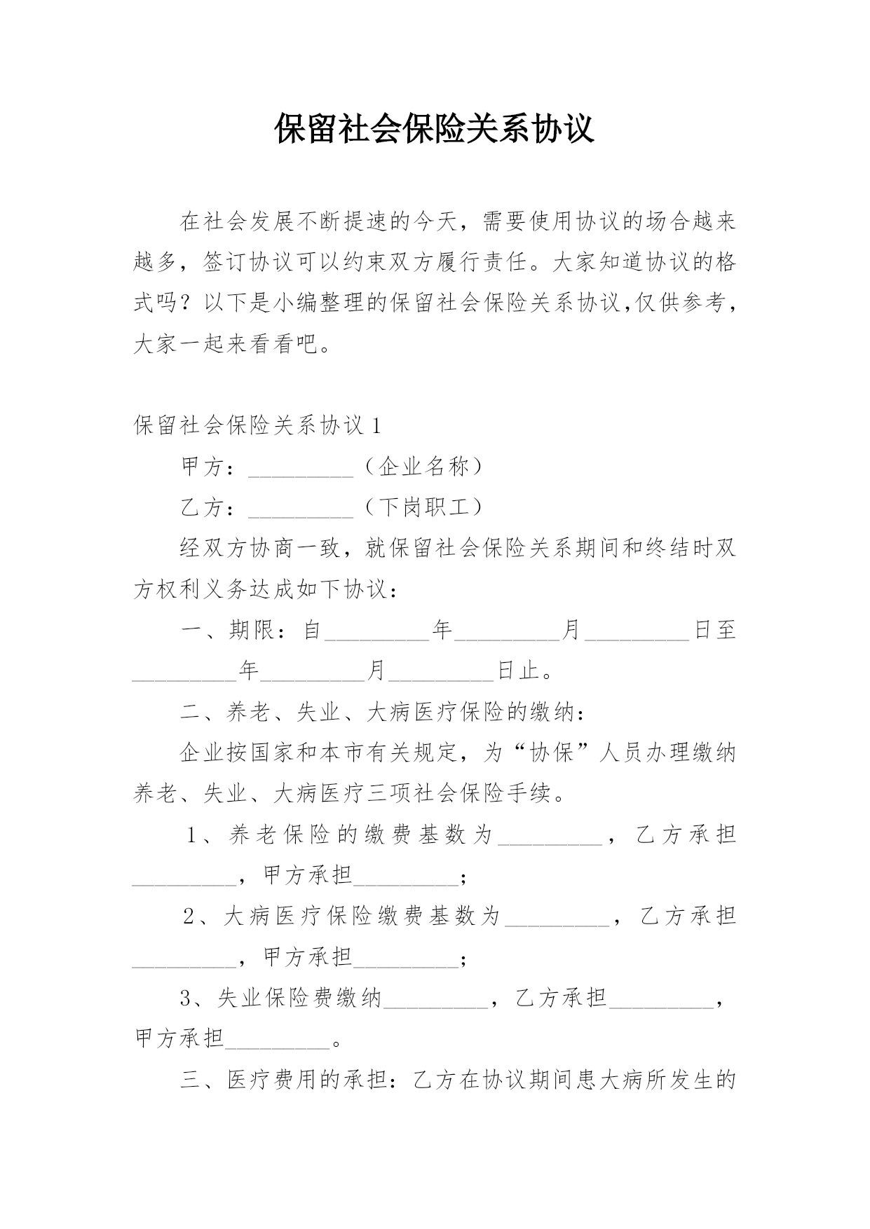 保留社会保险关系协议在社会发展不断提速的今天,需要使用协议的场合越来越多,签订协议可以约束双方履行责任。大家知道协议的格式吗?以下是小编整理的保留社会保险关系协议,仅供参考,大家一起来看看吧。保留社会保险关系协议1甲方:_________(企业名称)乙方:_________(下岗职工)经双方协商一致,就保留社会保险关系期间和终结时双方权利义务达成如下协议:一、期限:自_________年_________月_________日至_________年_________月_________日止。二、养老、失业