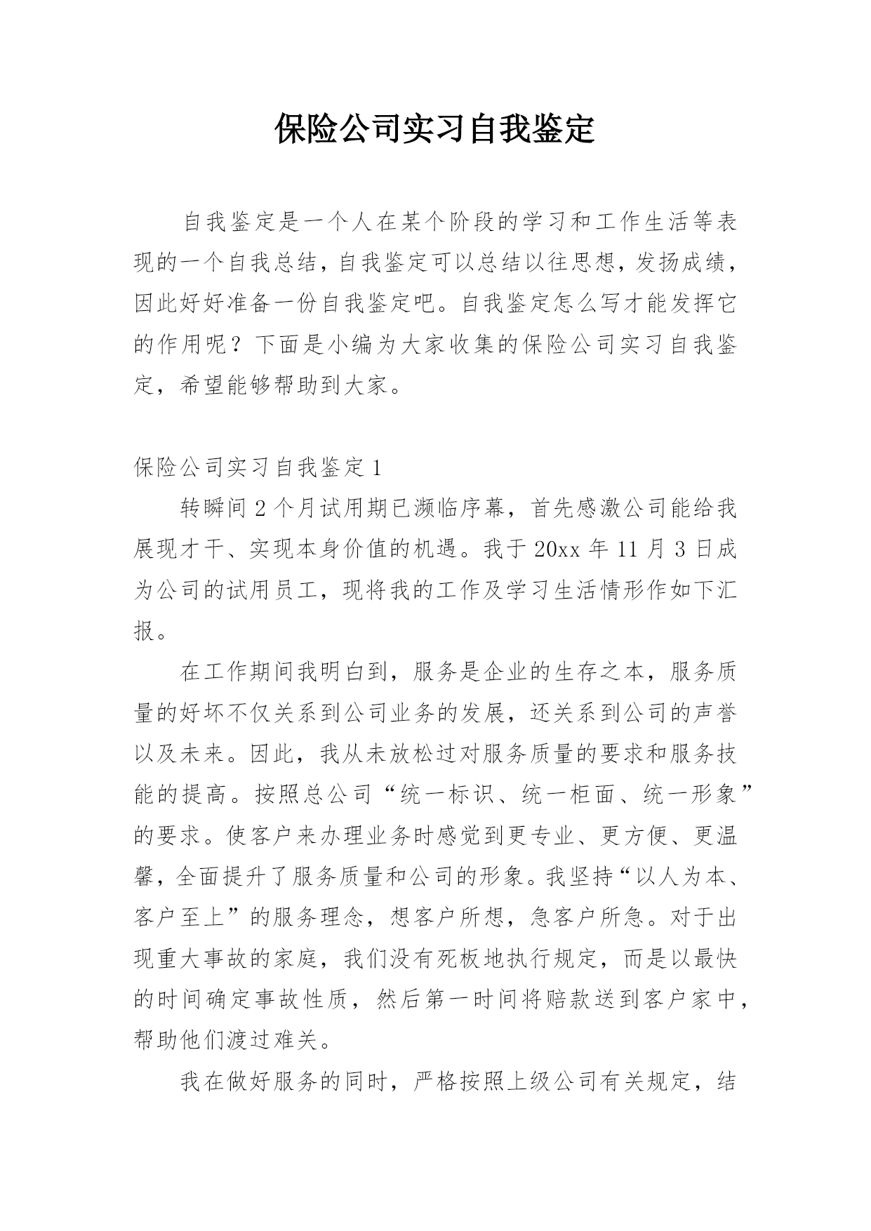 保险公司实习自我鉴定自我鉴定是一个人在某个阶段的学习和工作生活等表现的一个自我总结,自我鉴定可以总结以往思想,发扬成绩,因此好好准备一份自我鉴定吧。自我鉴定怎么写才能发挥它的作用呢?下面是小编为大家收集的保险公司实习自我鉴定,希望能够帮助到大家。保险公司实习自我鉴定1转瞬间2个月试用期已濒临序幕,首先感激公司能给我展现才干、实现本身价值的机遇。我于20xx年11月3日成为公司的试用员工,现将我的工作及学习生活情形作如下汇报。在工作期间我明白到,服务是企业的生存之本,服务质量的好坏不仅关系到公司业务的发展,