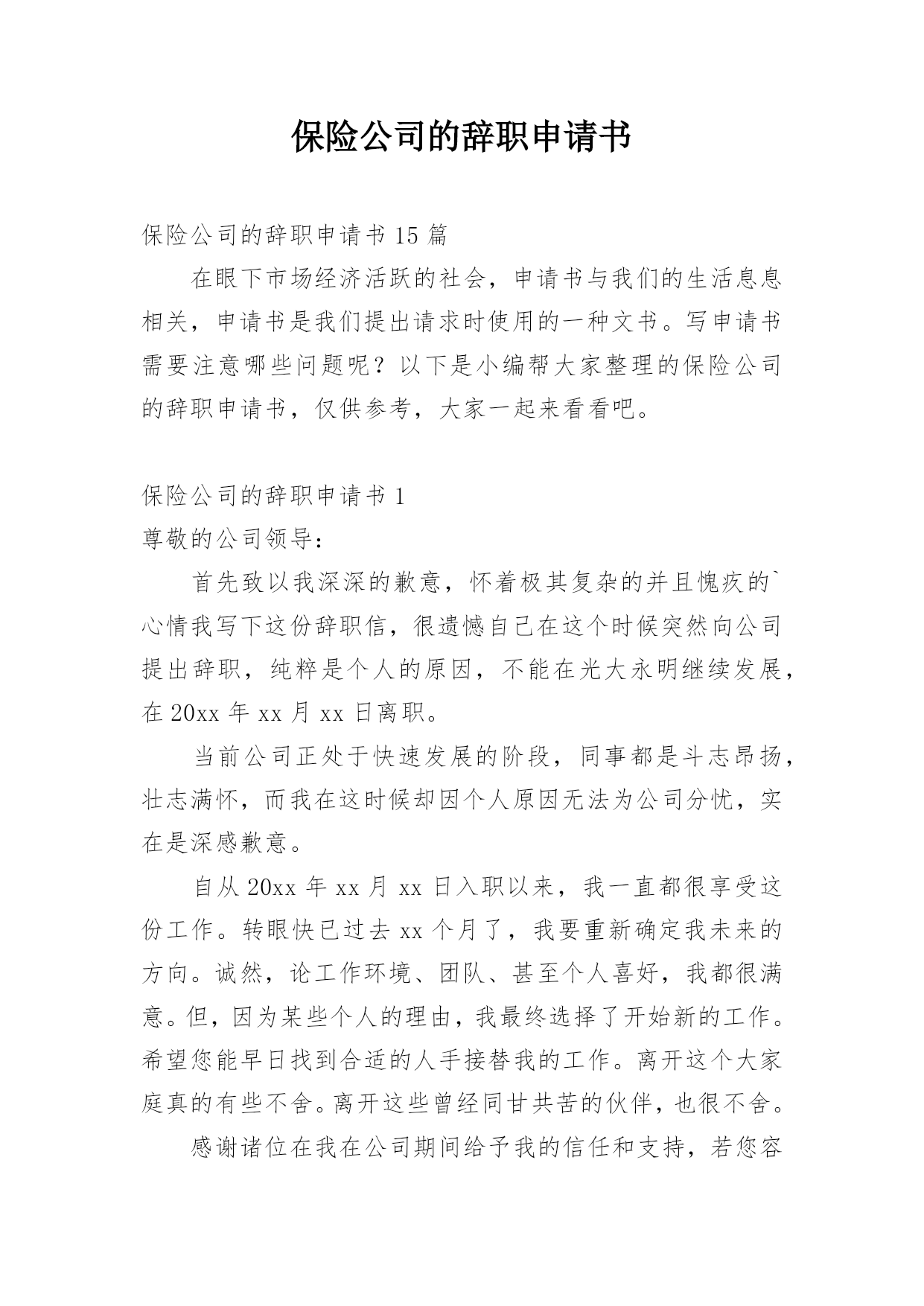 保险公司的辞职申请书保险公司的辞职申请书15篇在眼下市场经济活跃的社会,申请书与我们的生活息息相关,申请书是我们提出请求时使用的一种文书。写申请书需要注意哪些问题呢?以下是小编帮大家整理的保险公司的辞职申请书,仅供参考,大家一起来看看吧。保险公司的辞职申请书1尊敬的公司领导:首先致以我深深的歉意,怀着极其复杂的并且愧疚的`心情我写下这份辞职信,很遗憾自己在这个时候突然向公司提出辞职,纯粹是个人的原因,不能在光大永明继续发展,在20xx年xx月xx日离职。当前公司正处于快速发展的阶段,同事都是斗志昂扬,壮志