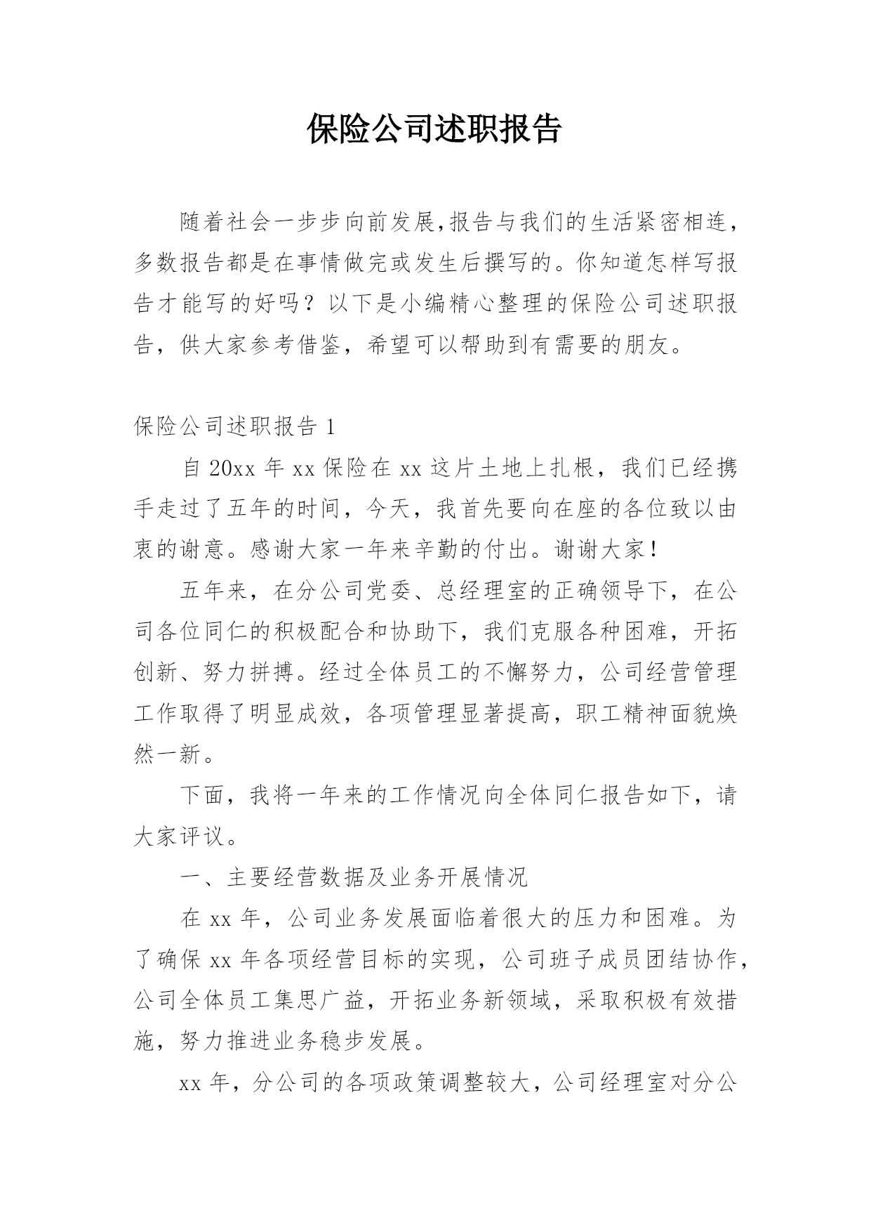 保险公司述职报告随着社会一步步向前发展,报告与我们的生活紧密相连,多数报告都是在事情做完或发生后撰写的。你知道怎样写报告才能写的好吗?以下是小编精心整理的保险公司述职报告,供大家参考借鉴,希望可以帮助到有需要的朋友。保险公司述职报告1自20xx年xx保险在xx这片土地上扎根,我们已经携手走过了五年的时间,今天,我首先要向在座的各位致以由衷的谢意。感谢大家一年来辛勤的付出。谢谢大家!五年来,在分公司党委、总经理室的正确领导下,在公司各位同仁的积极配合和协助下,我们克服各种困难,开拓创新、努力拼搏。经过全体员