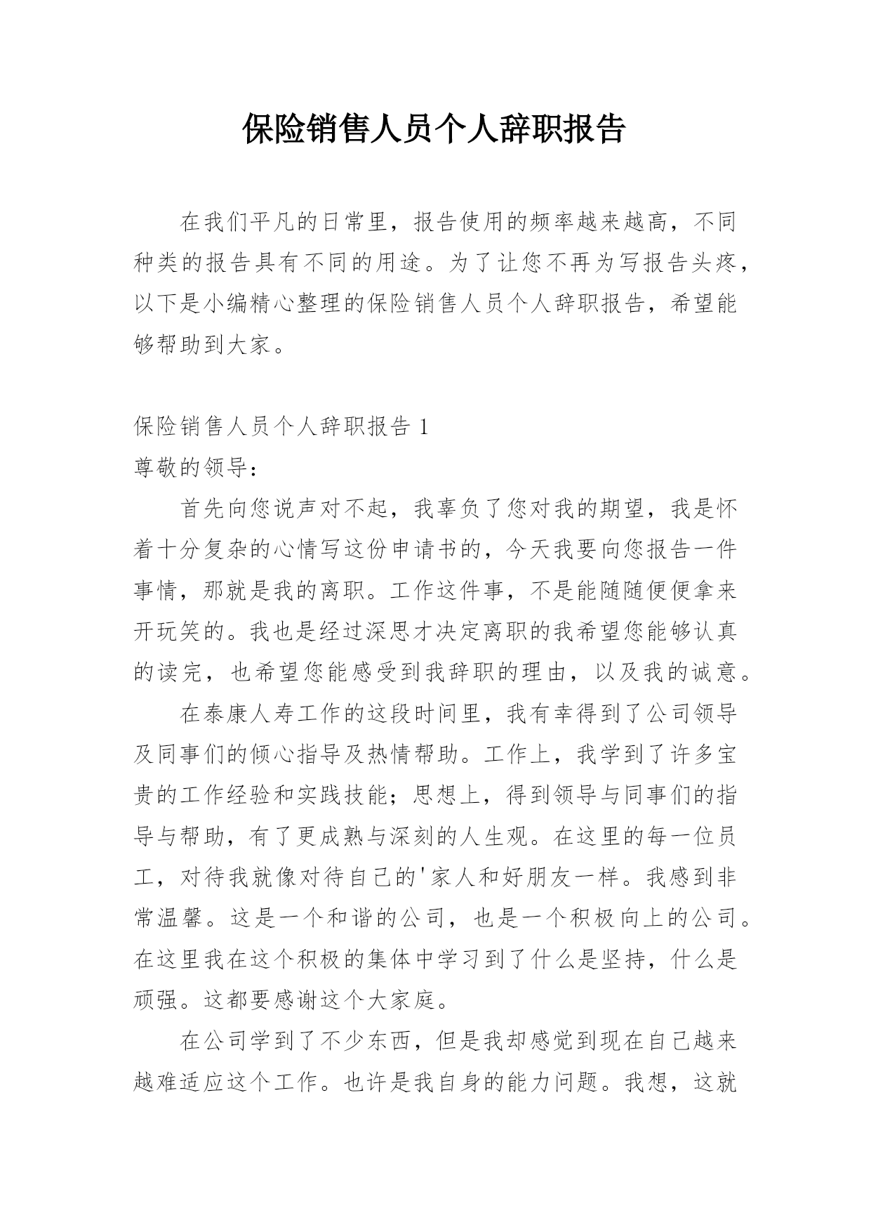 保险销售人员个人辞职报告在我们平凡的日常里,报告使用的频率越来越高,不同种类的报告具有不同的用途。为了让您不再为写报告头疼,以下是小编精心整理的保险销售人员个人辞职报告,希望能够帮助到大家。保险销售人员个人辞职报告1尊敬的领导:首先向您说声对不起,我辜负了您对我的期望,我是怀着十分复杂的心情写这份申请书的,今天我要向您报告一件事情,那就是我的离职。工作这件事,不是能随随便便拿来开玩笑的。我也是经过深思才决定离职的我希望您能够认真的读完,也希望您能感受到我辞职的理由,以及我的诚意。在泰康人寿工作的这段时间里