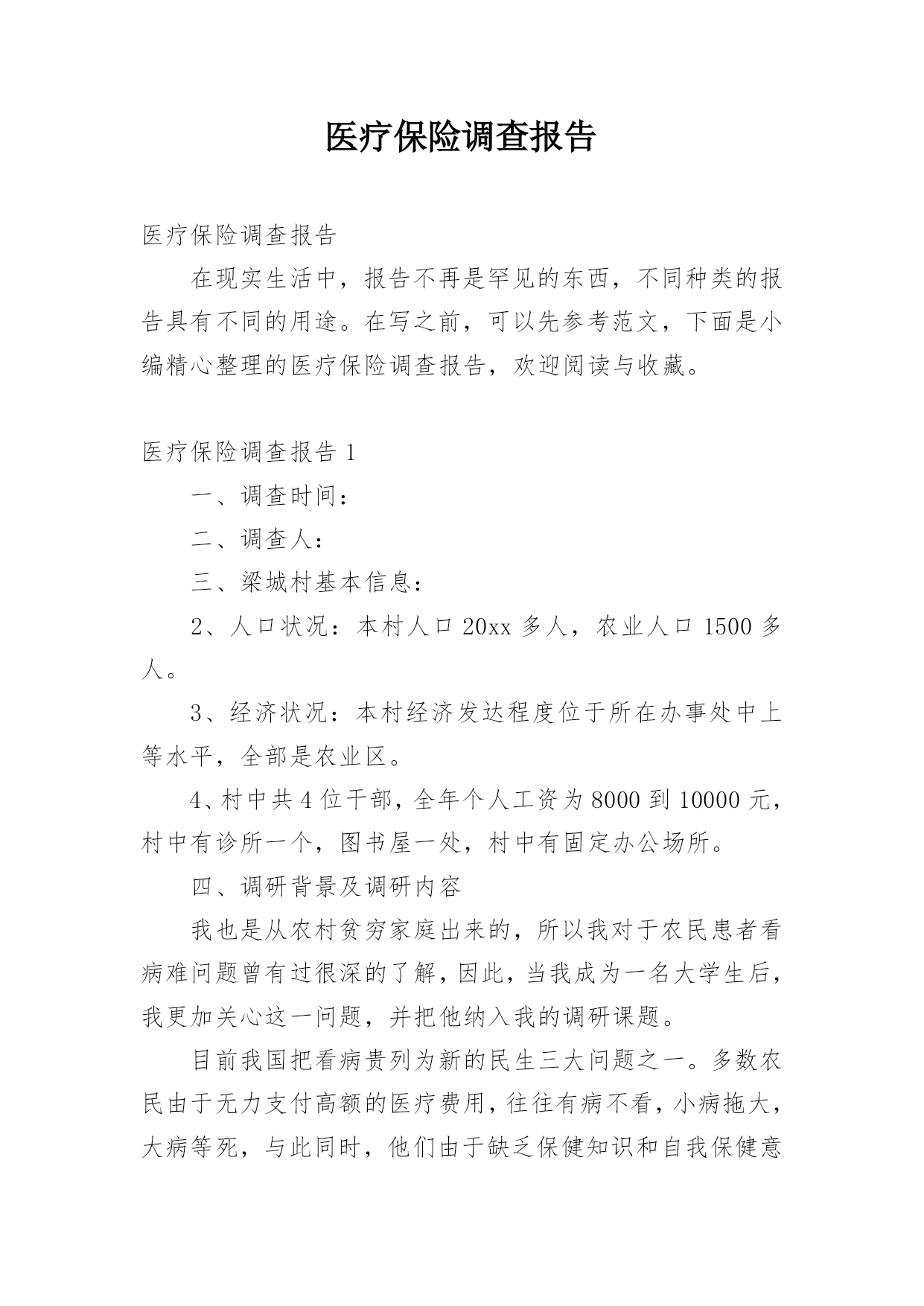 医疗保险调查报告医疗保险调查报告在现实生活中,报告不再是罕见的东西,不同种类的报告具有不同的用途。在写之前,可以先参考范文,下面是小编精心整理的医疗保险调查报告,欢迎阅读与收藏。医疗保险调查报告1一、调查时间:二、调查人:三、梁城村基本信息:2、人口状况:本村人口20xx多人,农业人口1500多人。3、经济状况:本村经济发达程度位于所在办事处中上等水平,全部是农业区。4、村中共4位干部,全年个人工资为8000到10000元,村中有诊所一个,图书屋一处,村中有固定办公场所。四、调研背景及调研内容我也是从农村