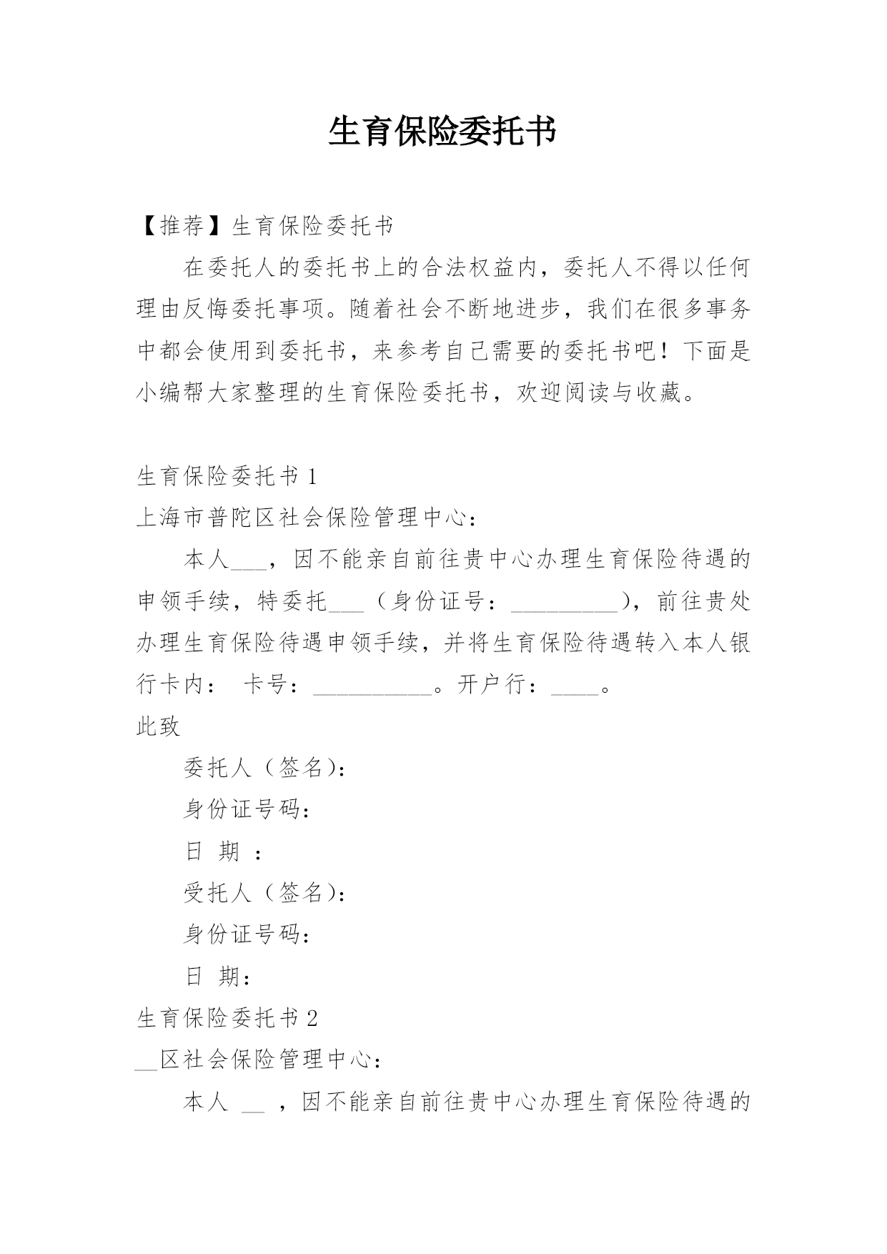 生育保险委托书【推荐】生育保险委托书在委托人的委托书上的合法权益内,委托人不得以任何理由反悔委托事项。随着社会不断地进步,我们在很多事务中都会使用到委托书,来参考自己需要的委托书吧!下面是小编帮大家整理的生育保险委托书,欢迎阅读与收藏。生育保险委托书1上海市普陀区社会保险管理中心:本人___,因不能亲自前往贵中心办理生育保险待遇的申领手续,特委托___(身份证号:_________),前往贵处办理生育保险待遇申领手续,并将生育保险待遇转入本人银行卡内:卡号:__________。开户行:____。此致委托