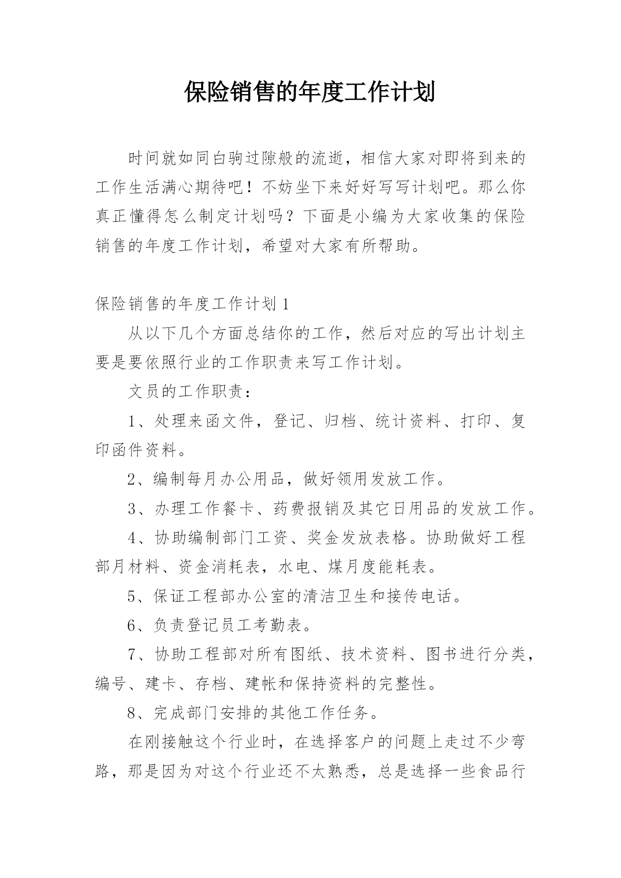 保险销售的年度工作计划时间就如同白驹过隙般的流逝,相信大家对即将到来的工作生活满心期待吧!不妨坐下来好好写写计划吧。那么你真正懂得怎么制定计划吗?下面是小编为大家收集的保险销售的年度工作计划,希望对大家有所帮助。保险销售的年度工作计划1从以下几个方面总结你的工作,然后对应的写出计划主要是要依照行业的工作职责来写工作计划。文员的工作职责:1、处理来函文件,登记、归档、统计资料、打印、复印函件资料。2、编制每月办公用品,做好领用发放工作。3、办理工作餐卡、药费报销及其它日用品的发放工作。4、协助编制部门工资、